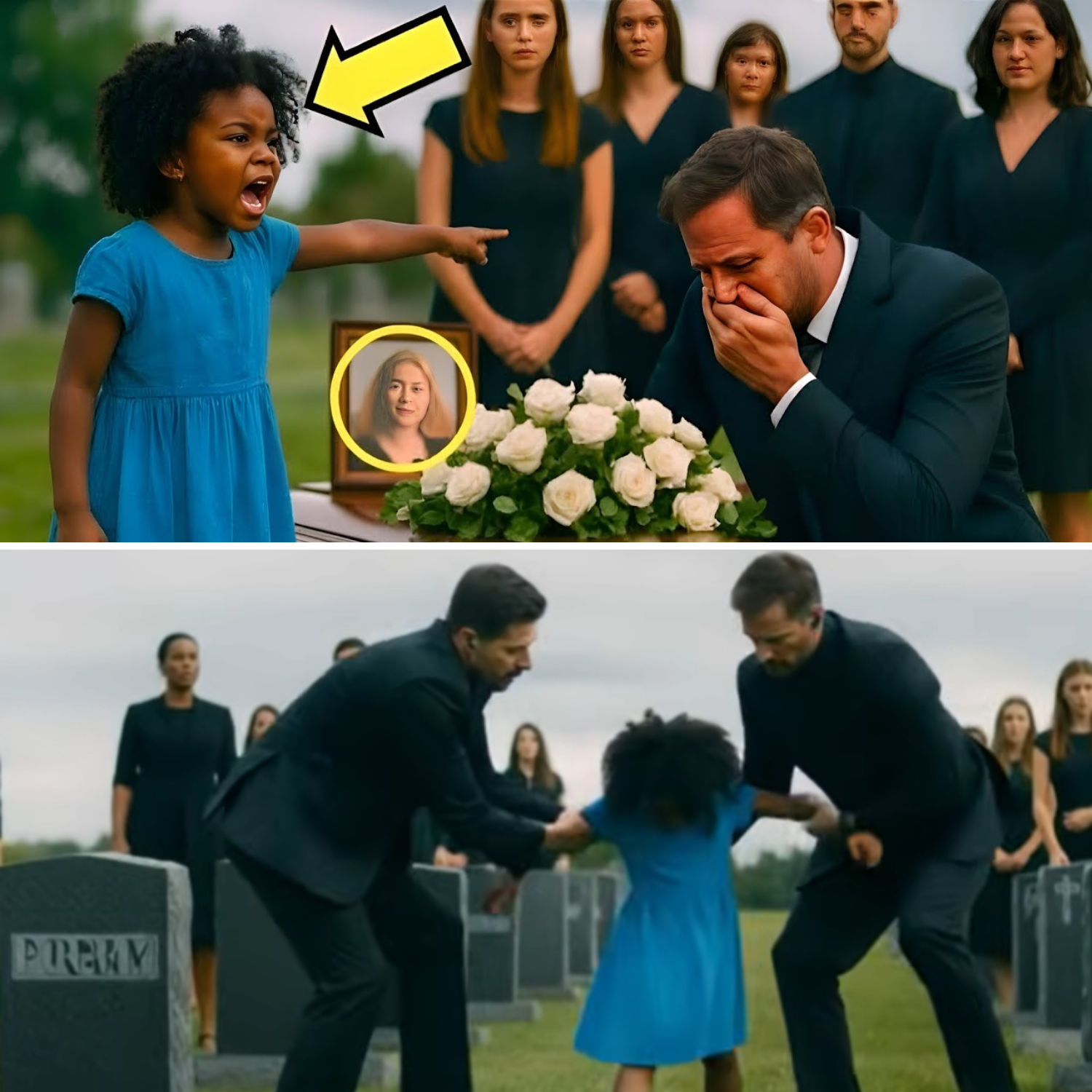 “That’s a lie!” The voice was high, urgent, and impossible to ignore. Heads whipped around as a tiny figure darted between gravestones—a seven-year-old girl in a faded blue dress, wild curls flying, sandals patched with tape. “Stop! Stop the funeral! She’s not dead. Mrs. Catherine is alive!” Security lunged, but the girl was fast, desperate, and unafraid. She grabbed Marcus’s sleeve, her hand trembling. “Please. Your wife, she’s in Mercy Hills nursing home, room 307. I saw her three days ago. She’s alive.” The crowd rippled with shock. Marcus stared down, grief and confusion battling in his eyes. “What are you saying? Who are you?” “Maya Jenkins,” she sobbed. “I sleep behind Mercy Hills sometimes. I saw her through the window. She was breathing. Tubes everywhere, but she was alive.”