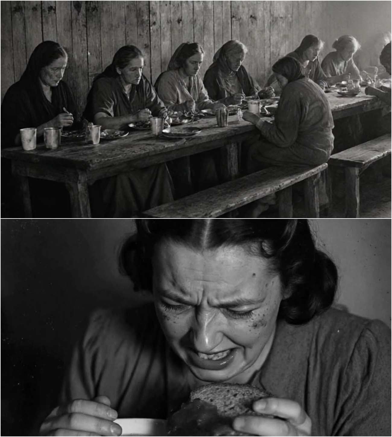 Only when the soldiers insisted—physically handing them plates and guiding them toward the food line—did the reality begin to sink in. Then something unforgettable happened. As the first bowls of hot stew were served, several of the German POWs began to cry—quietly at first, then openly, uncontrollably. One woman collapsed to her knees before even taking a bite, overwhelmed by the kindness she had not expected. Others struggled to eat, their hands shaking so violently that spoons rattled against the metal bowls.