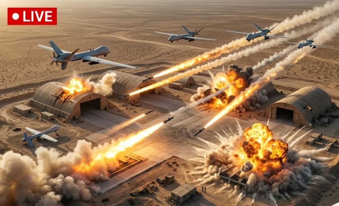 The operation occurred just minutes ago. Multiple MQ-9 Reapers, operating with advanced Israeli intelligence support, unleashed a devastating barrage of Hellfire missiles and precision-guided bombs on the heavily camouflaged facility. Satellite imagery and real-time footage show the entire complex — hidden in a remote desert region — engulfed in mᴀssive secondary explosions as stored Shahed drones, fuel, and missile components detonated in a chain reaction.