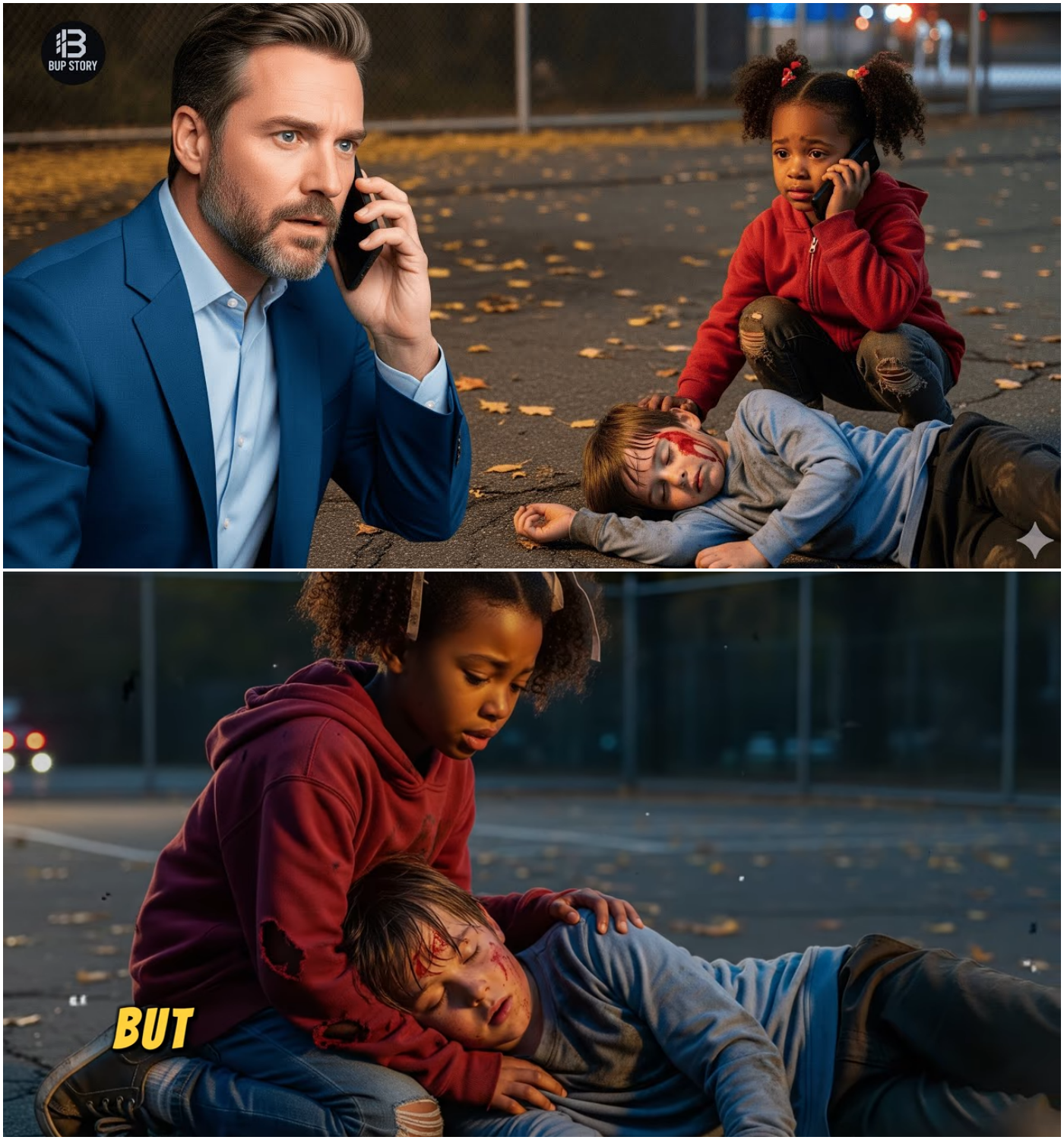 As he reached the scene, chaos reigned. Paramedics hovered over a small figure on the ground, surrounded by autumn leaves stained with blood. **“Ethan!”** Richard shouted, his heart pounding in his chest. There, amidst the chaos, stood a little girl in a red hoodie, her jeans soaked at the cuffs, shivering but unwavering, her eyes locked onto Ethan. **“I didn’t want him to be alone,”** she said softly, her voice breaking through Richard’s panic.