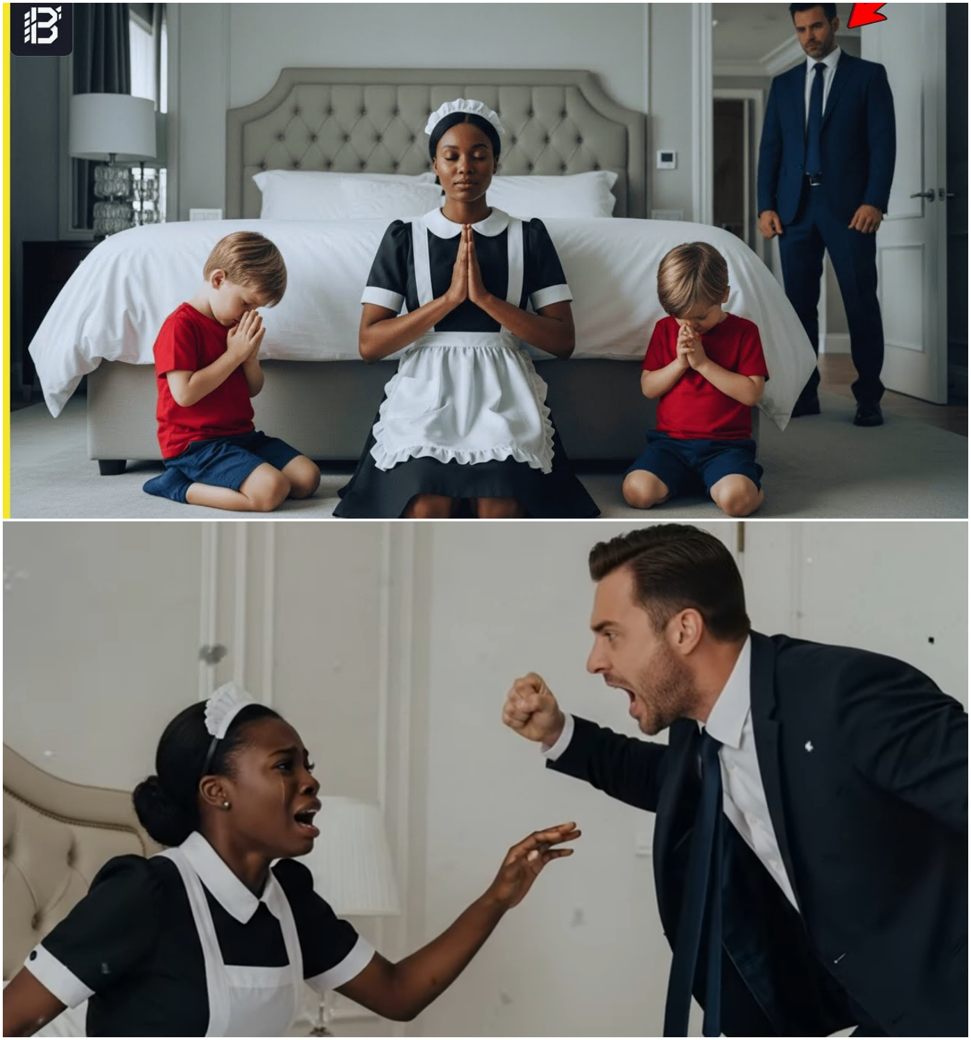 On a cold winter evening, the silence of the Reed household was shattered by a voice filled with anger and disbelief. **“Are you teaching my sons to pray? What the hell is this? A church?”** Alexander Reed’s booming voice echoed down the hallway, reverberating through the softly lit bedroom where his five-year-old twin boys, Ben and Theo, knelt on the rug, their small hands clasped together in prayer. Across from them, Maya Williams, their black maid, was caught in a moment that would change everything.