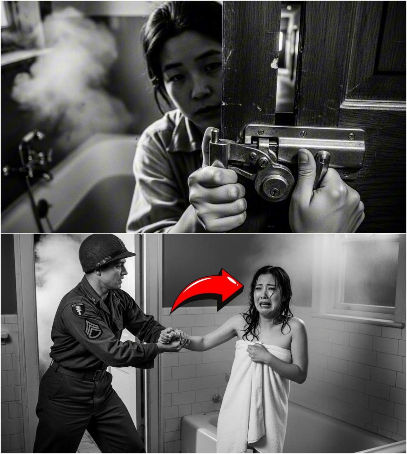 As they entered the officer’s private bathroom, the first thing Kazumi noticed was the scent of floral aftershave, a stark contrast to the stench of sweat and fear that had filled the POW barracks. The officer’s room was meticulously clean—white tiles, gleaming porcelain, and a bathtub with chrome fixtures. The water was already running, steam rising from the faucet, as though it had been prepared just for her. Everything about this place felt wrong, out of place, in contrast to the grime and filth she had grown accustomed to in the camp.