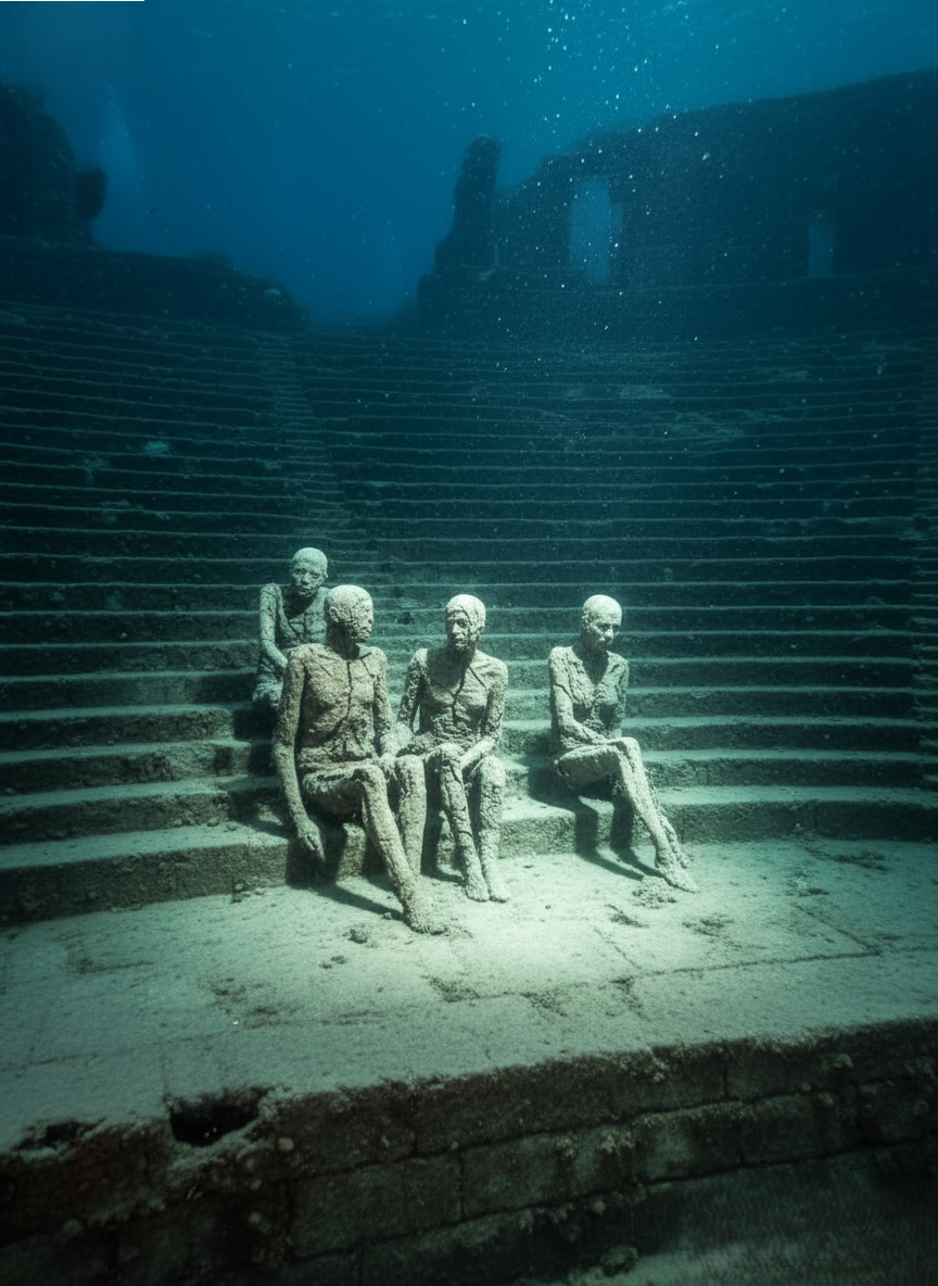 Within days of the footage leaking online, the site was sealed by naval authorities, with research data classified under “maritime security.” Governments have declined to comment, but whispers within the archaeological community point to evidence of advanced engineering and materials inconsistent with any known ancient culture. Could this be the lost heart of a civilization erased by the seas, or even a remnant of the fabled Atlantis — its citizens caught in a single, frozen moment of destruction? As debates rage, the image of the amphitheater endures: row upon row of silent witnesses staring toward a vanished stage, preserved in the deep’s eternal hush. Whatever spectacle they once beheld, it was powerful enough to be remembered by the ocean itself. The question is — why was it buried, and what story were they watching when the sea took its final bow?