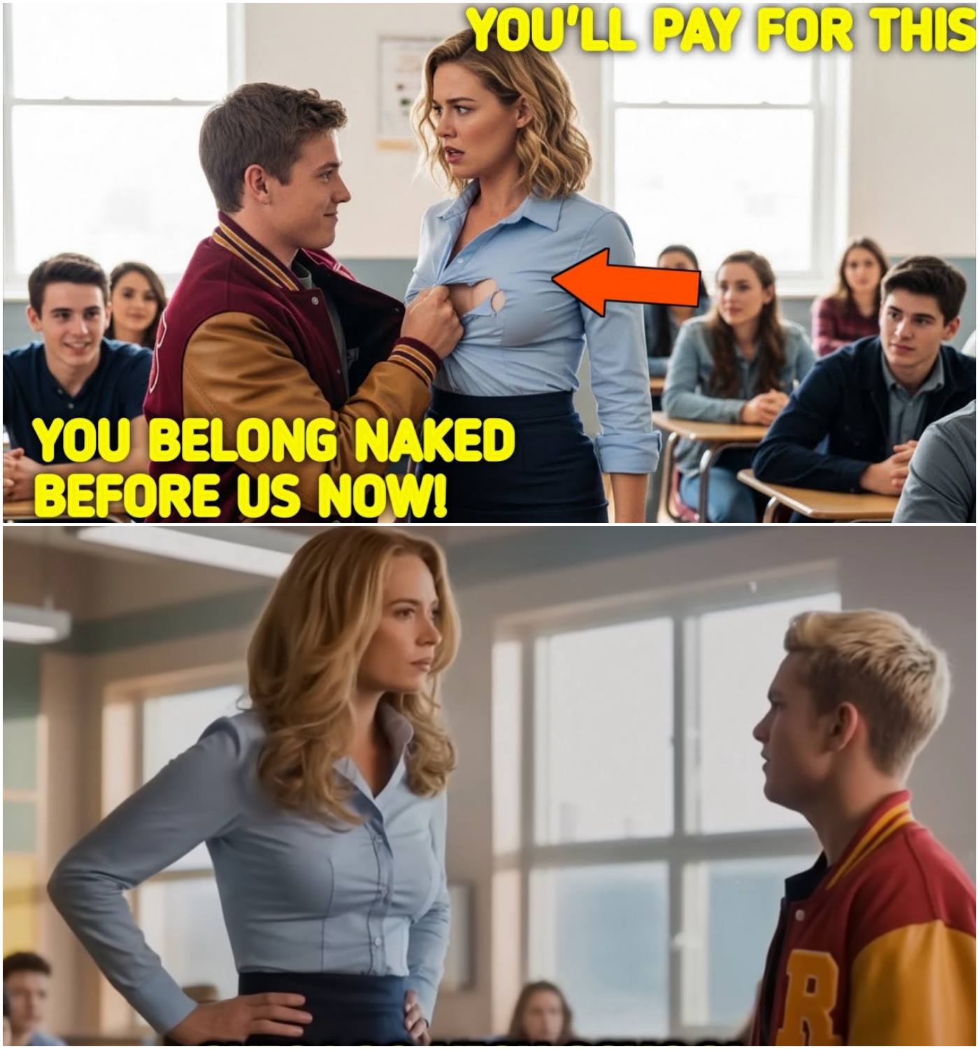 The bell rang, echoing through the halls of Ridgeway High, but the sound was drowned out by a tense silence that enveloped the classroom. Students froze, eyes wide, as they watched the new teacher, Ms. Alina Reyes, stand before them, clutching the torn fabric of her blouse. Humiliation burned on her face as laughter erupted from a trio of notorious bullies at the back of the room. Derek, Ryan, and Kurt—the school’s resident troublemakers—were notorious for their cruelty, and today was no exception.