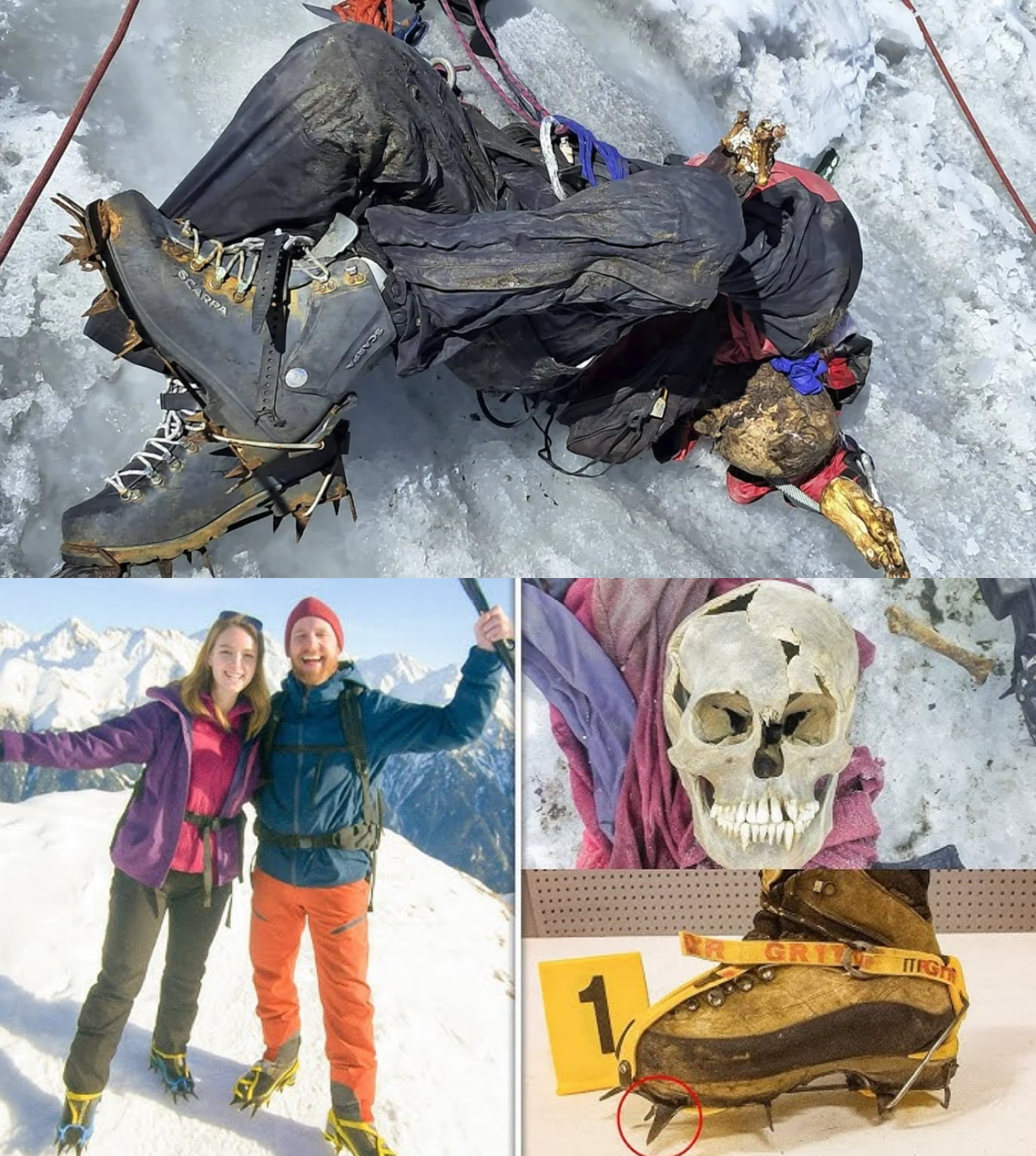 Weeks later, a ski mountaineer named Leo explored the altered terrain. He spotted a flash of pink and purple—fabric emerging from melting ice. It was a jacket sleeve, attached to a bone. Nearby, a human skull lay in a meltwater pool, ribs and vertebrae scattered around. A heavy mountaineering boot, with a yellow-strapped crampon, lay on its side. Leo realized the mountain was giving back one of its lost souls.