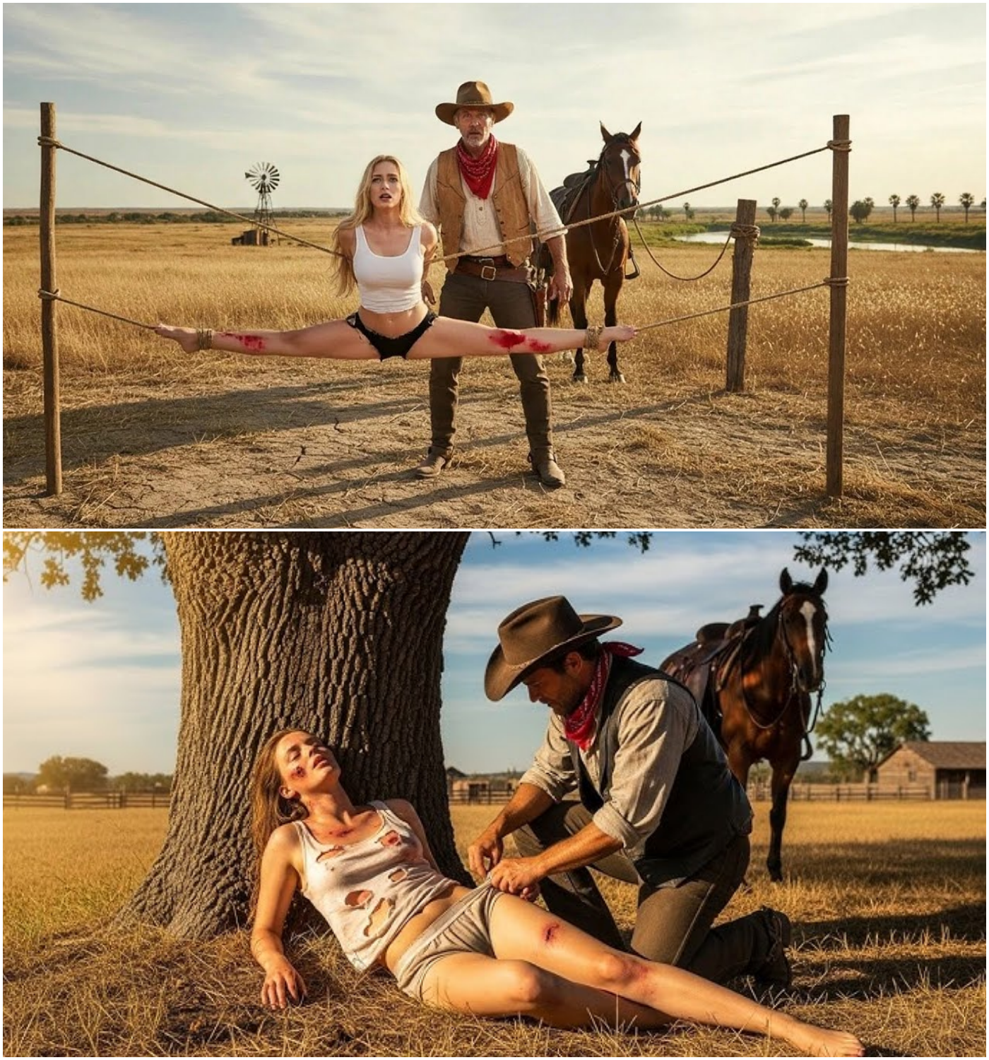 Cole Harding yanked the reins of his horse, stopping abruptly at the top of the ridge. The scorching wind lifted clouds of dust, and through them he saw something that froze his blood: a young woman lying in the sand, half-naked, covered in dried blood, her wrists tied behind her back and her legs stretched by two ropes staked to the ground. As if the midday sun itself were part of the punishment.