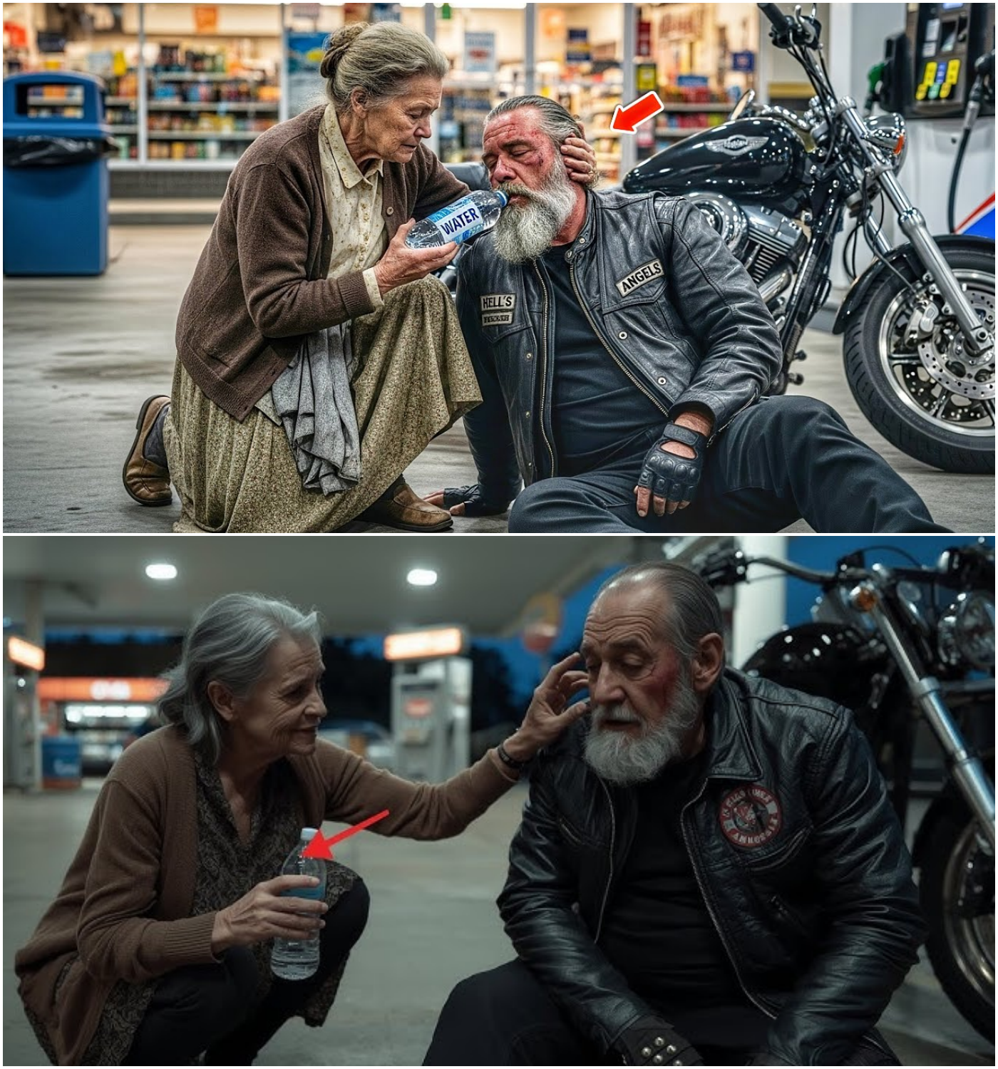 When she returned, the man, who she later learned was named Colton, was slumped against his bike, trying to hide his pain. Ignoring the stares of passersby who couldn’t understand why a woman her age would risk herself like that, she knelt beside him. She opened the bottle, helped him drink, and cleaned the blood from his cheek. “You’ll be all right,” she whispered softly, her voice as gentle as the rain falling around them. “Sometimes, even the strongest people need a little help.”