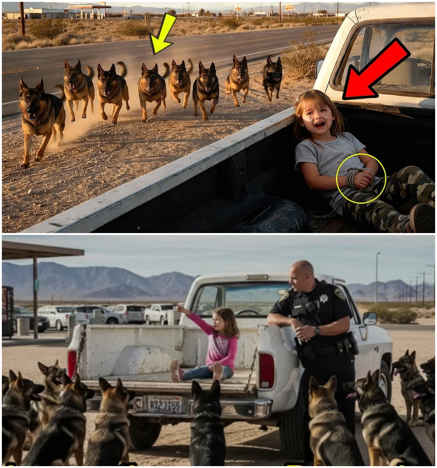 The desert stretched endlessly, the highway slicing through it like a river of cracked asphalt. Everything seemed ordinary, too ordinary, but the pickup truck told another story. Rust clung to its sides, and inside, the girl curled in the shadows. Her heart pounded as she glanced at the K9s resting nearby, powerful animals with piercing amber eyes. If anyone could save her, it would be them.