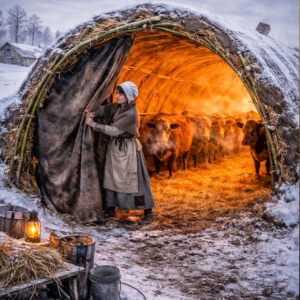 A frontier woman bends green saplings into arched frames over her open cattle pen and weaves them tight, covering the structure with layers of straw and plastered mud. It creates a long insulated tunnel over the pen — the cows’…
