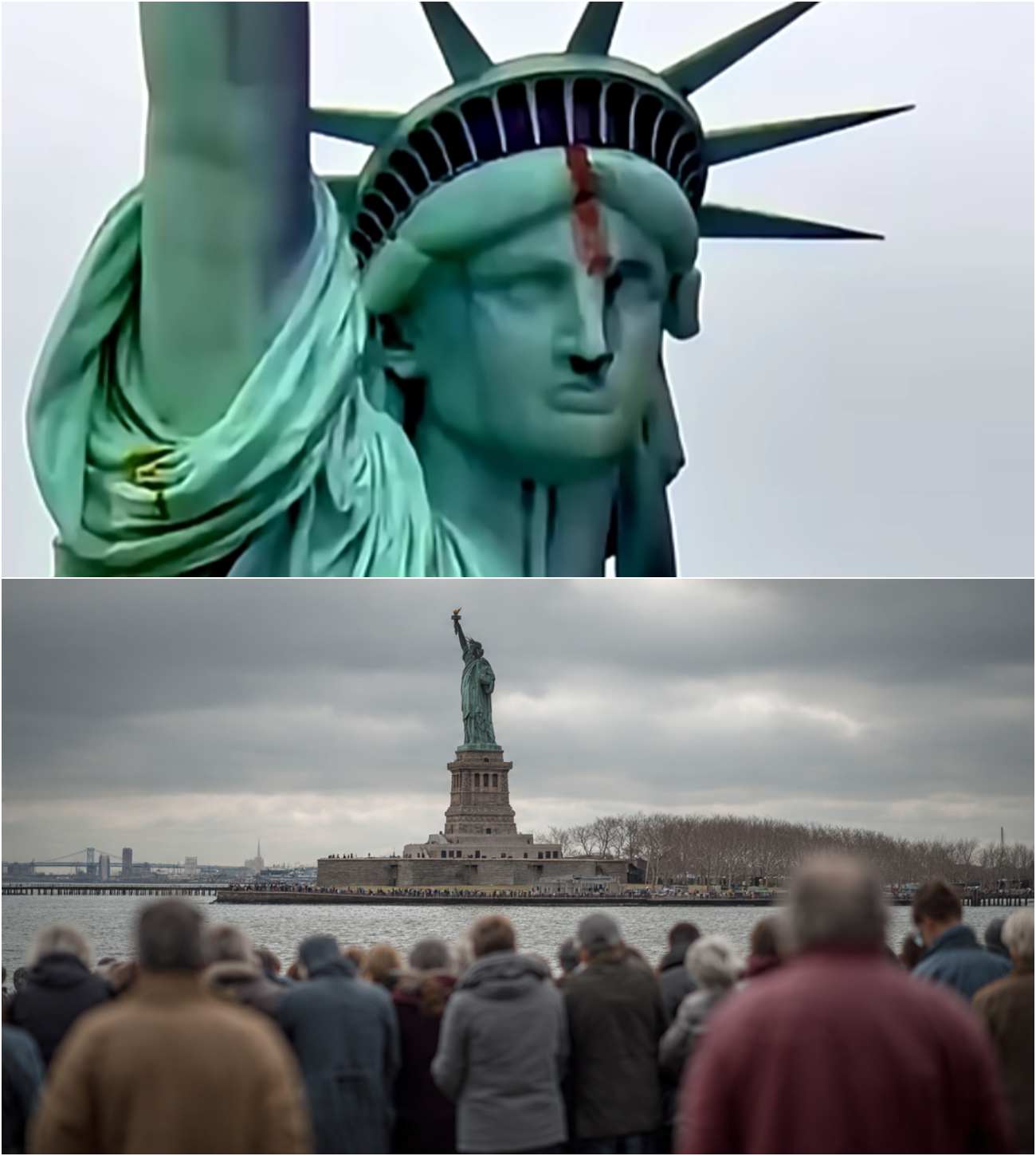 In an event that stunned the world and left a nation paralyzed in disbelief, the unthinkable happened: the Statue of Liberty, the iconic symbol of American freedom, was seen bleeding. As the shocking image spread across the media, conspiracy theories began swirling, with many claiming it to be a sign of America’s deep, irreversible decline. Was this merely a grotesque art installation, a stunt, or something far more ominous?