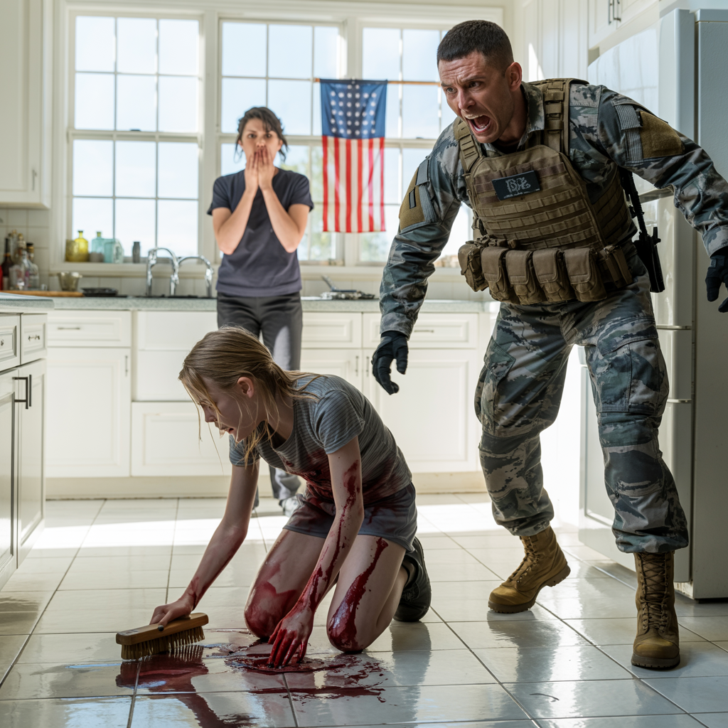 Ella’s head shot up. Her father, Sergeant Daniel Parker, stood in the doorway, his military uniform dusty from a week-long deployment. His eyes widened at the scene before him — the blood, the exhaustion, the tiny figure collapsed on the kitchen floor.