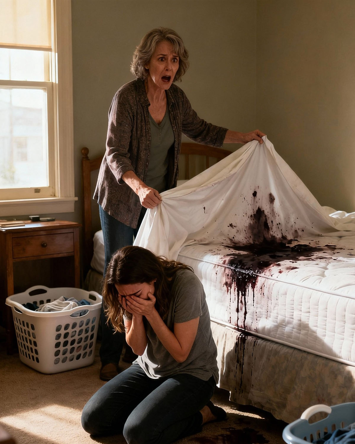 When I slipped into the guest house, I froze. A thick, metallic smell filled the air. My stomach turned. I stepped closer to the bed and lifted the top sheet. What I saw made my heart stop — dark, dense stains soaked deep into the mattress. Blood.