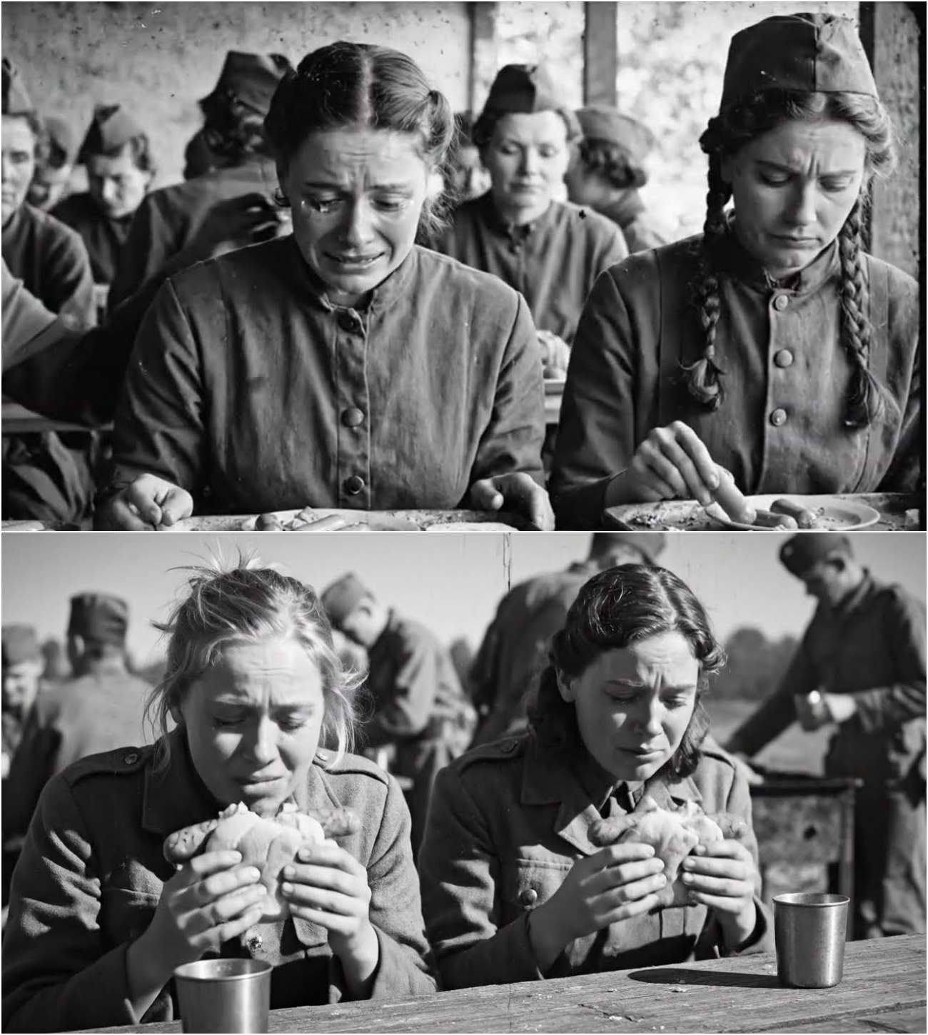 The women around me sat silently, staring at their meals as I did, unsure of how to proceed. No one moved. The food sat untouched, as if the very act of eating would betray something deeper. The guards were sitting nearby, eating their own meals, laughing casually, as if they weren’t guarding prisoners but simply sharing a meal. The whole situation felt wrong. This couldn’t be real. It was too normal.
