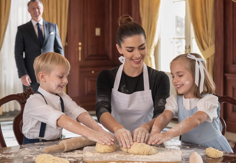 His children were laughing uncontrollably, covered in flour, while Clara, equally amused, was teaching them how to knead dough by hand.
