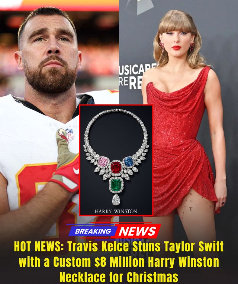 Inside was an $8M Harry Winston diamond necklace, 120 carats, glowing so violently that if you turned off every light in the house, it could still illuminate an entire stadium. Taylor shielded her eyes: “Travis… why does it shine like a car headlight?” He shrugged: “I told them to make it ‘stand out a little’…”