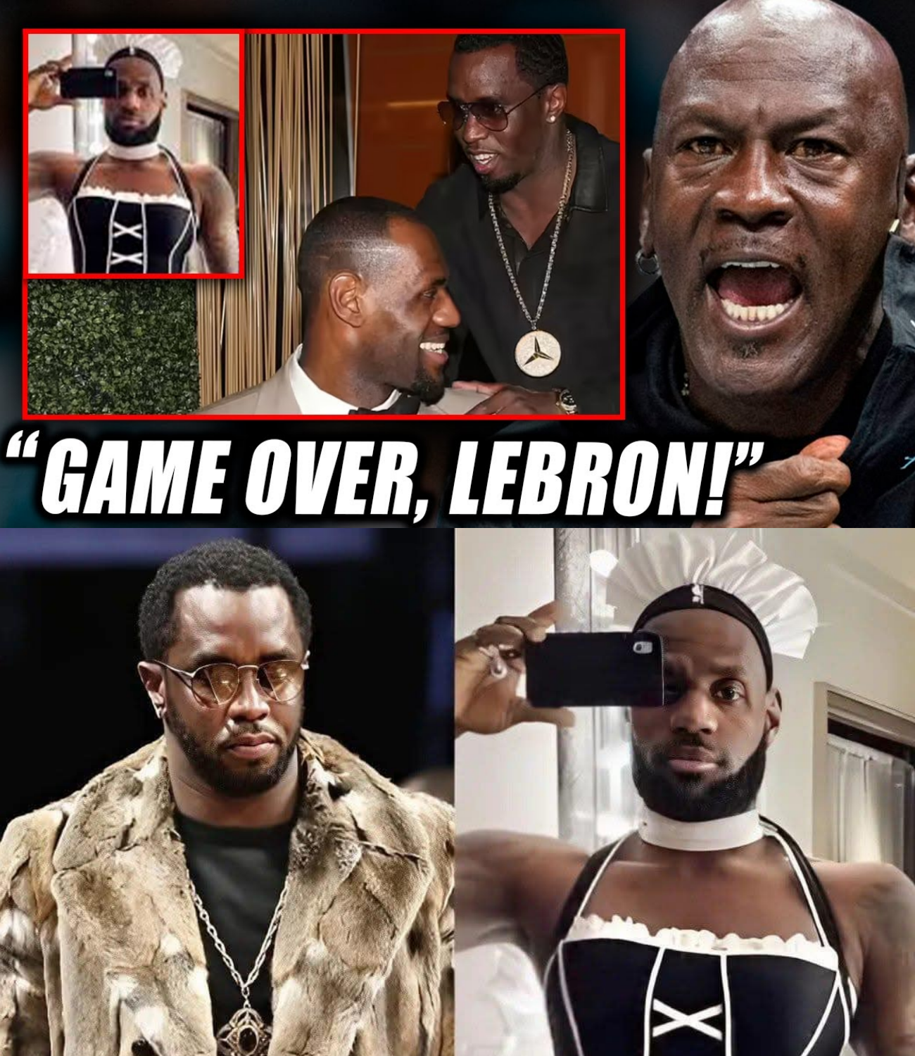 A bizarre photo of LeBron in a maid’s dress, claimed to be from a secret party, debated as AI but never denied.