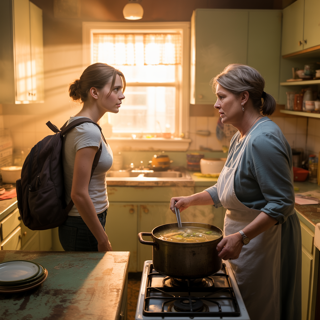 The late-afternoon sun slanted through the small kitchen window, casting long golden lines across the faded linoleum floor of the Harper household. Emily Harper, a 22-year-old college student, stormed into the kitchen, her backpack thudding heavily onto the table. Frustration radiated from her as she clenched her jaw, her sharp eyes glaring at her mother, Linda, who stood at the stove, stirring a pot of soup—the same soup they had almost every day.