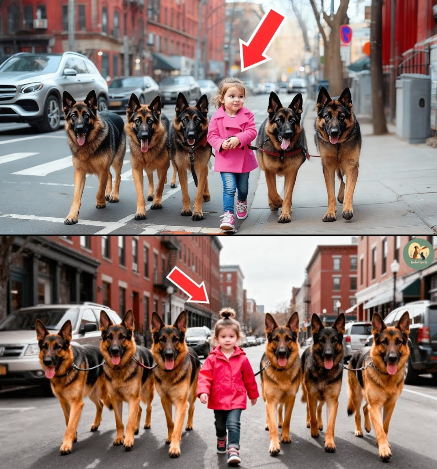 Every morning at precisely 7:00 a.m., the quiet neighborhood of Maple Street was treated to an extraordinary sight: a tiny girl, no older than six, walking five massive German Shepherds down the street. Clad in a bright pink coat that seemed far too fancy for the chilly morning air, she walked with a silent determination that captivated onlookers. Some smiled, others recorded videos, but no one knew her story or where she came from.