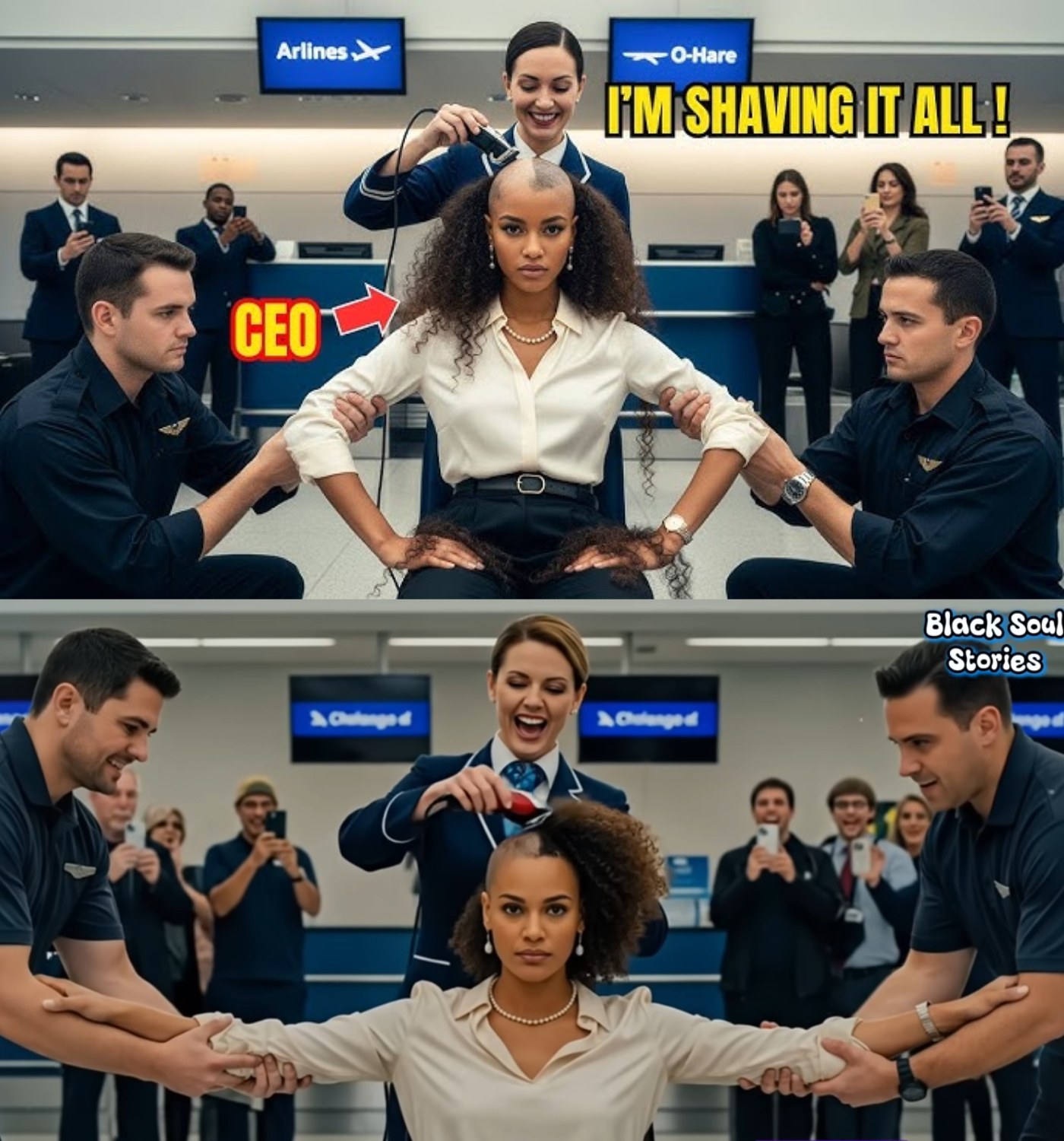 Amara, a successful CEO of Johnson Aviation Solutions, was known for her natural hair—a crown of curls that represented her identity and heritage. But to Karen and her colleagues, Amara’s hair was deemed unprofessional. As the scissors sliced through Amara’s beautiful curls, the crowd gathered, phones recording, some cheering, others jeering. “Cut it all off!” they shouted, reveling in the humiliation.