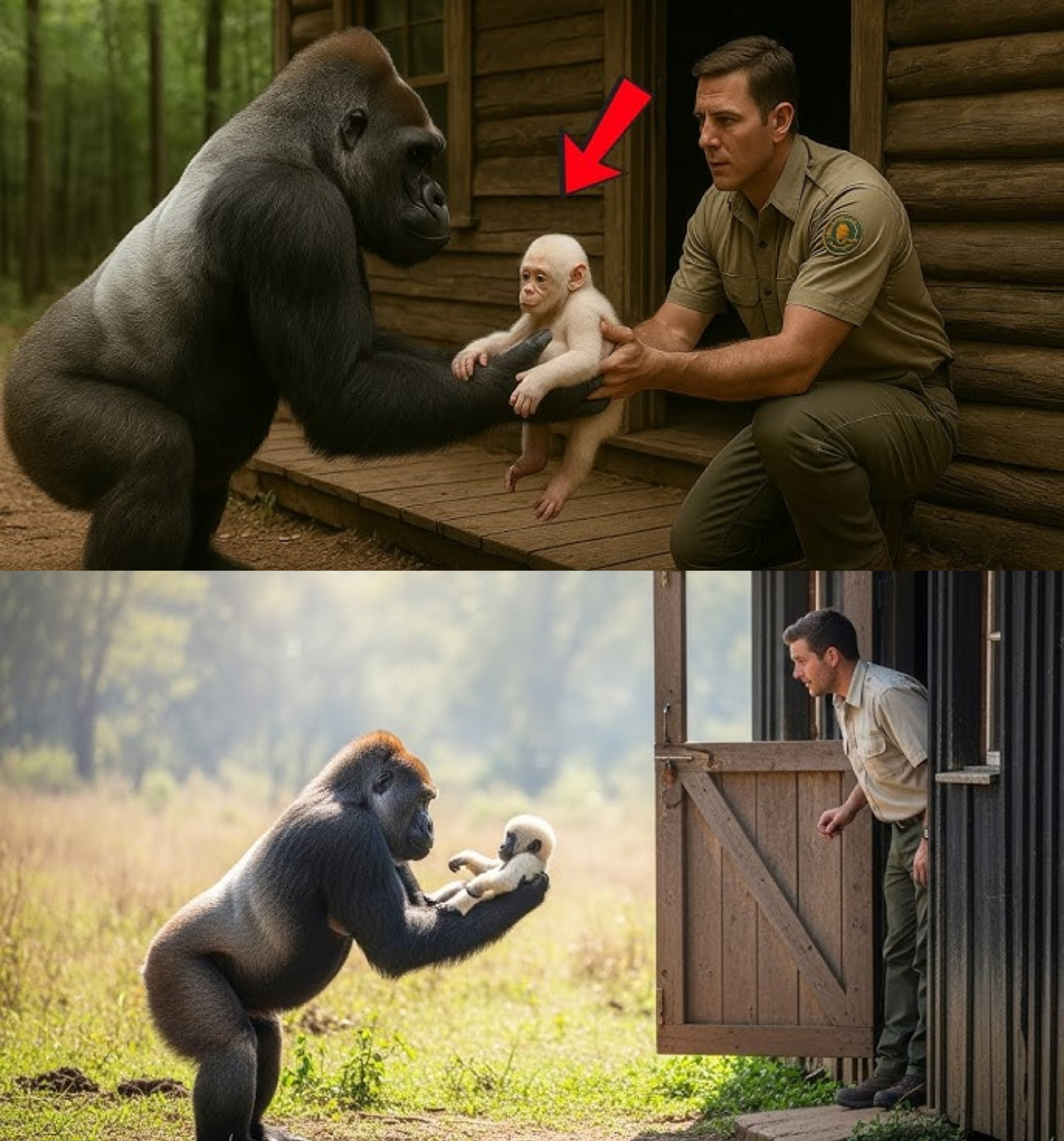 Before him stood the enormous mother gorilla, trembling and sorrowful, with her small, snow-white baby carefully cradled in one hand. In that moment, a single tear traced a path down her dark cheek—a silent, gut-wrenching cry of surrender. She gently pushed the baby gorilla toward Elias, imploring him to take what she could not save. This was not an act of aggression; it was a profound expression of trust.