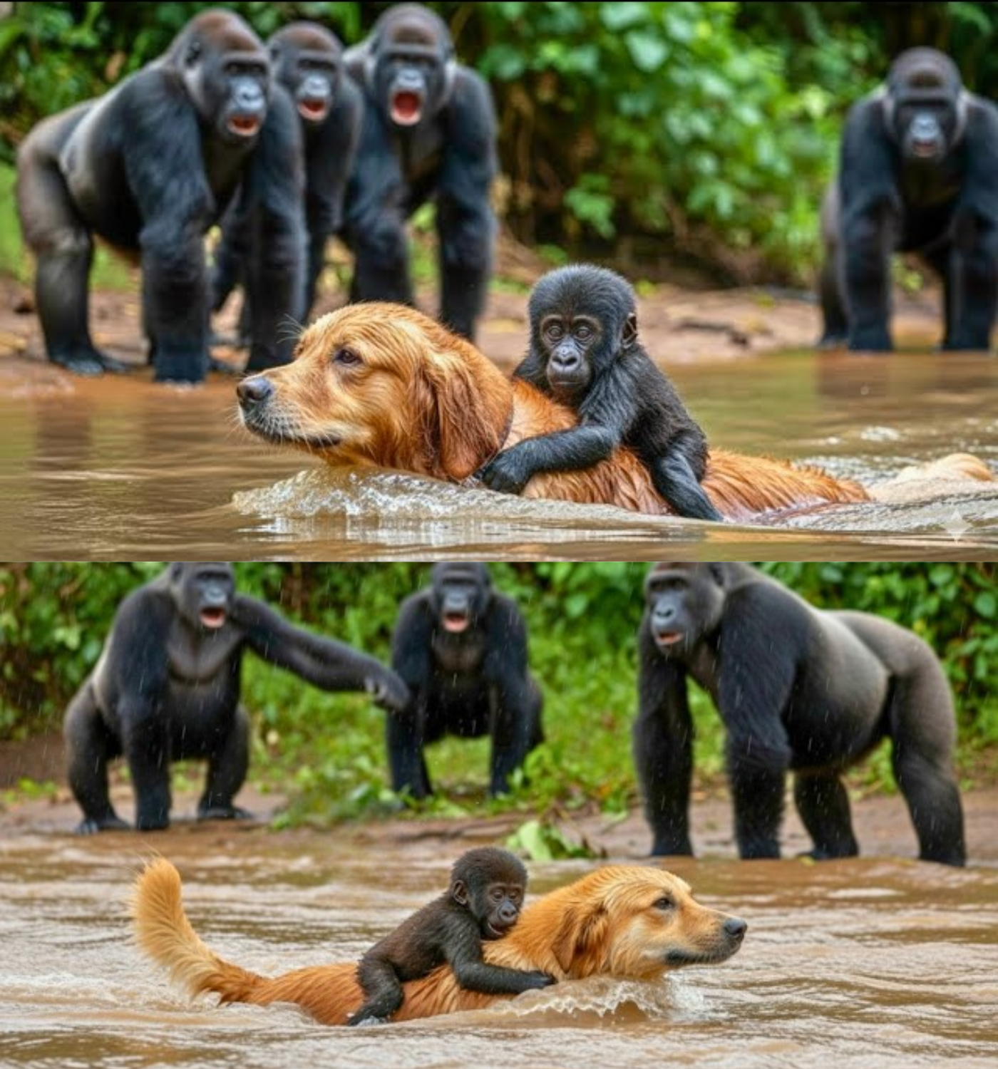 As the golden retriever fought against the current, the baby gorilla began to drift away, exhausted and shivering. Just as it was about to be pulled under, the golden retriever intercepted it. With a graceful maneuver, the dog turned its body, offering a platform of warm fur. In a moment of pure cross-species understanding, the baby gorilla reached out, clutching the soaked fur tightly as if it were its only lifeline.