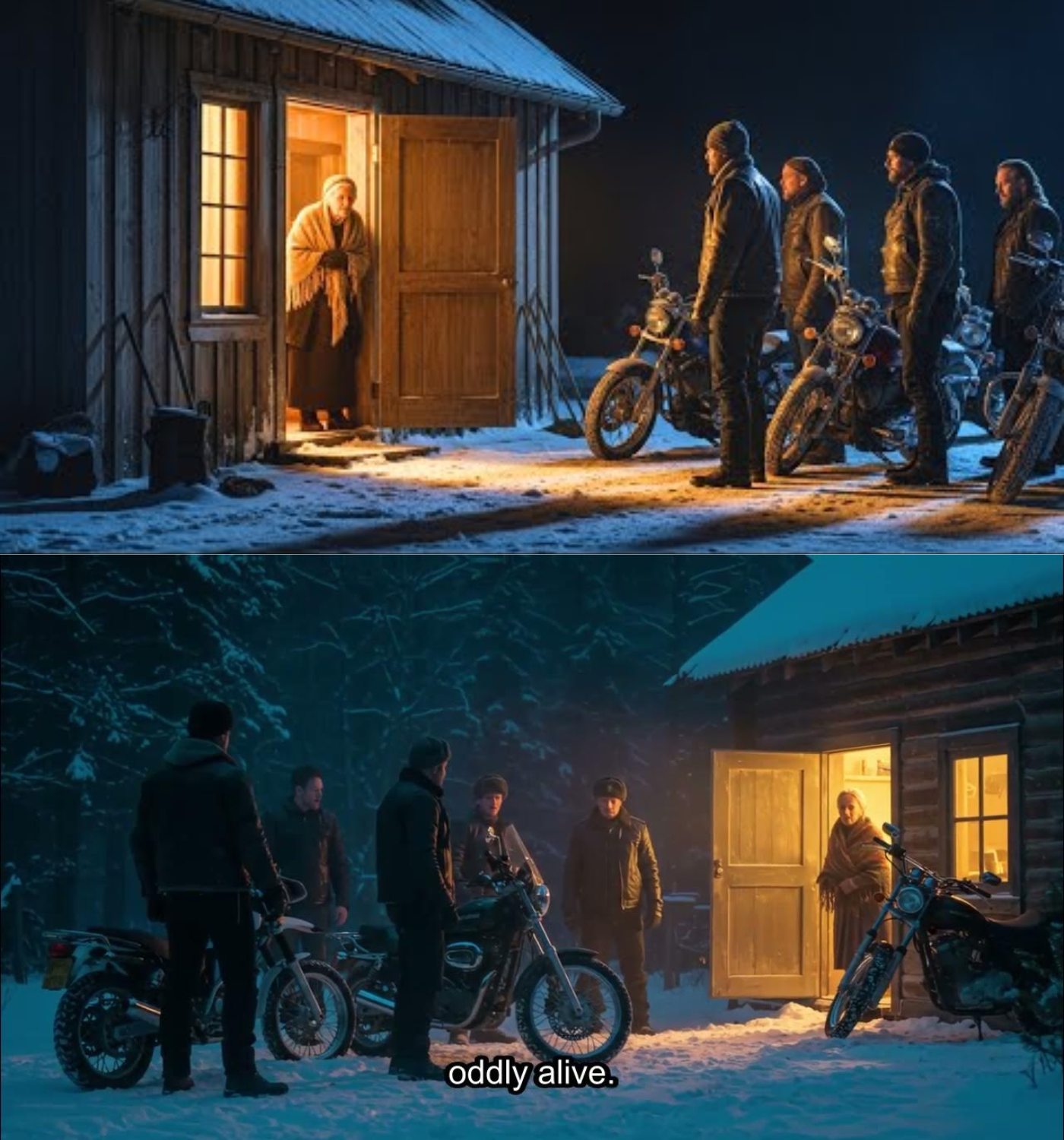 On this particular night, the storm outside grew fiercer, snow swirling violently, obscuring the world beyond her window. As Martha sat in her old armchair, the flickering light of a single lamp cast shadows that danced across the walls, reminding her of the life that once thrived within them. She had grown accustomed to the quiet, but tonight, something felt different. The sound of roaring motorcycle engines pierced through the howling wind, drawing her attention.