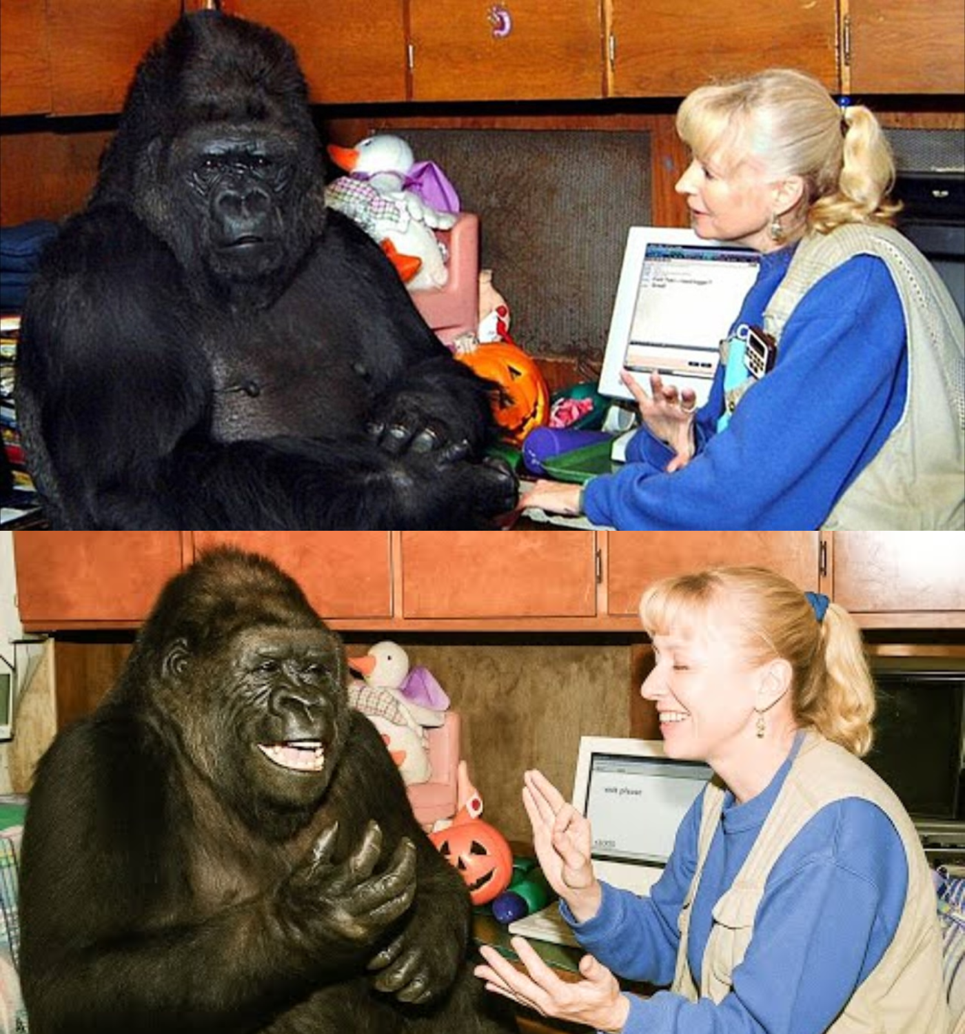 One of the most poignant moments came when Koko saw a picture of another ape about to take a bath, a situation she disliked. She signed, “I cry there.” This ability to convey feelings demonstrated her growing emotional intelligence. Koko’s humor also shone through; she once jokingly called herself a “good bird” and pretended she could fly, only to admit it was a joke.