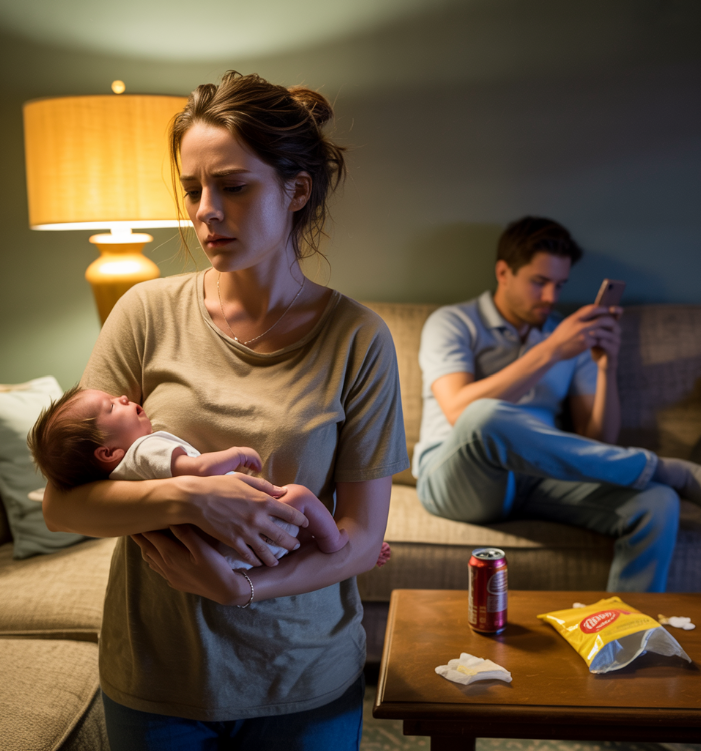 On the couch, Daniel lay sprawled out, one leg propped up, his eyes glued to his phone. An empty soda can and a half-finished bag of chips sat on the coffee table, the only evidence of his responsibilities. It had been three weeks since we brought Noah home. Three weeks filled with broken sleep, constant feeding, and endless crying—both his and mine.