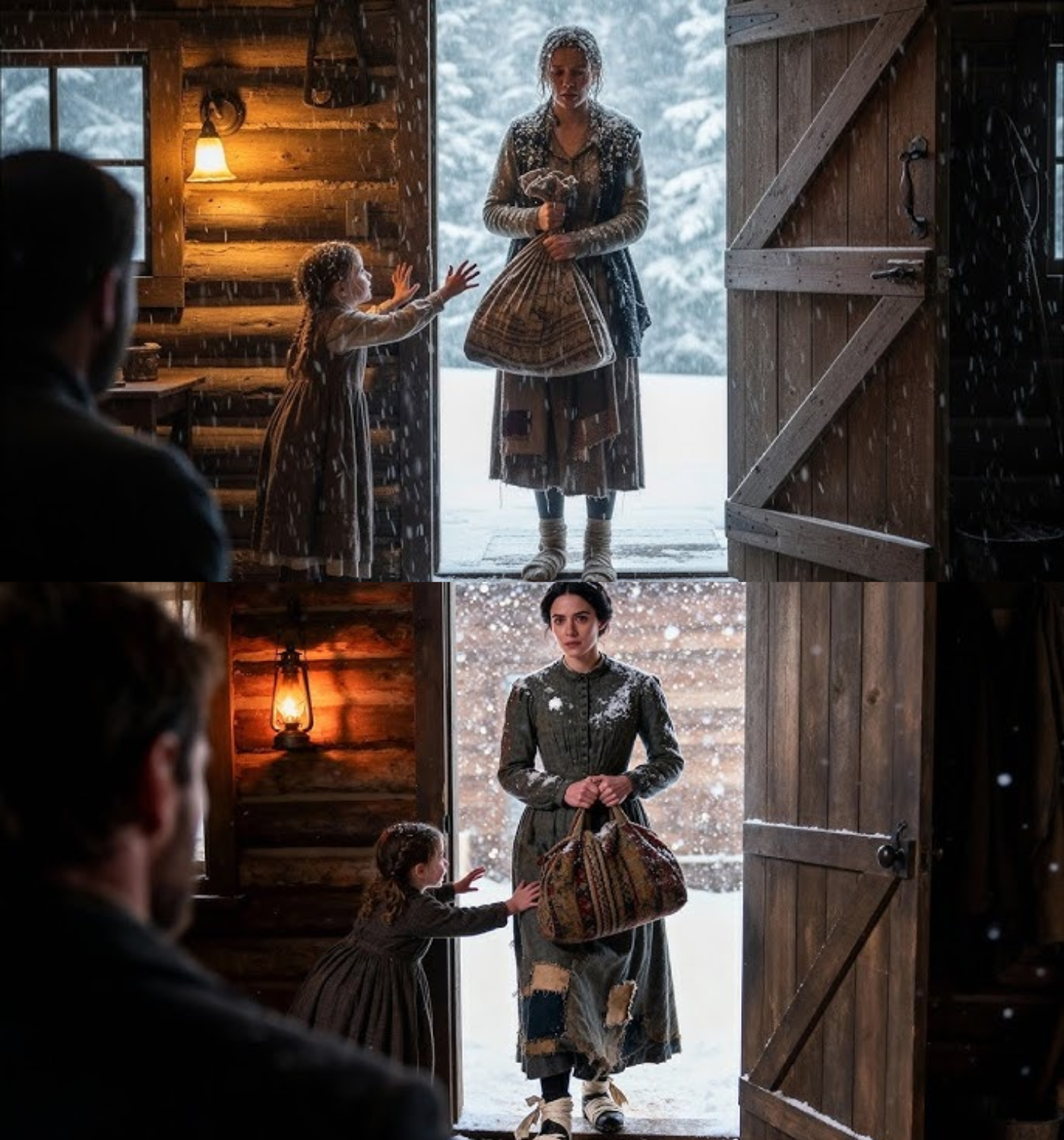 A sudden knock shattered the silence. Hannah gasped, “She’s here!” Eli’s heart raced as he crossed the cabin. His hand hesitated on the door latch before he took a deep breath and opened it.