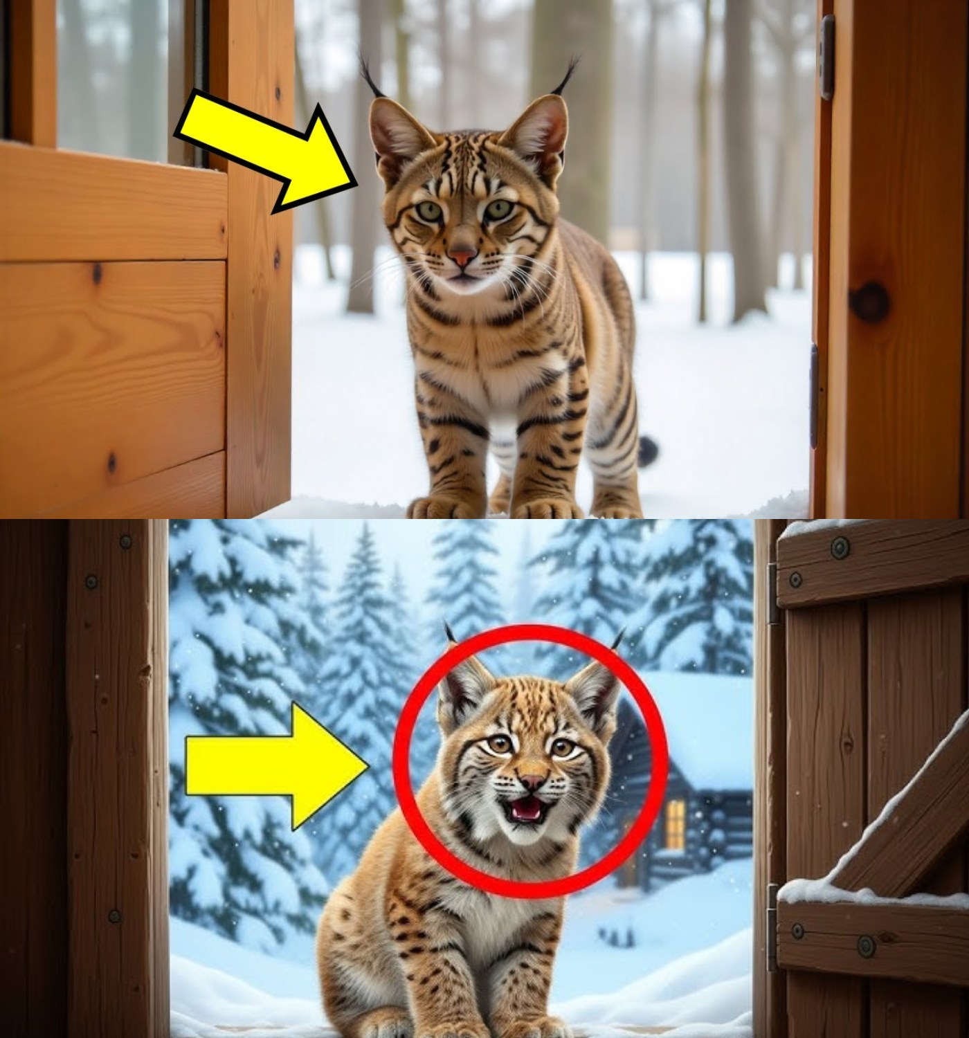 As evening fell, a soft scratching sound came from the rear door, freezing him in place. Thomas moved cautiously to the kitchen window and peered outside. What he saw made his blood run cold. A mature bobcat stood just beyond the door, her fur blanketed in snow, her body thin and trembling. Her golden eyes reflected the moonlight as she gazed directly at the cabin.