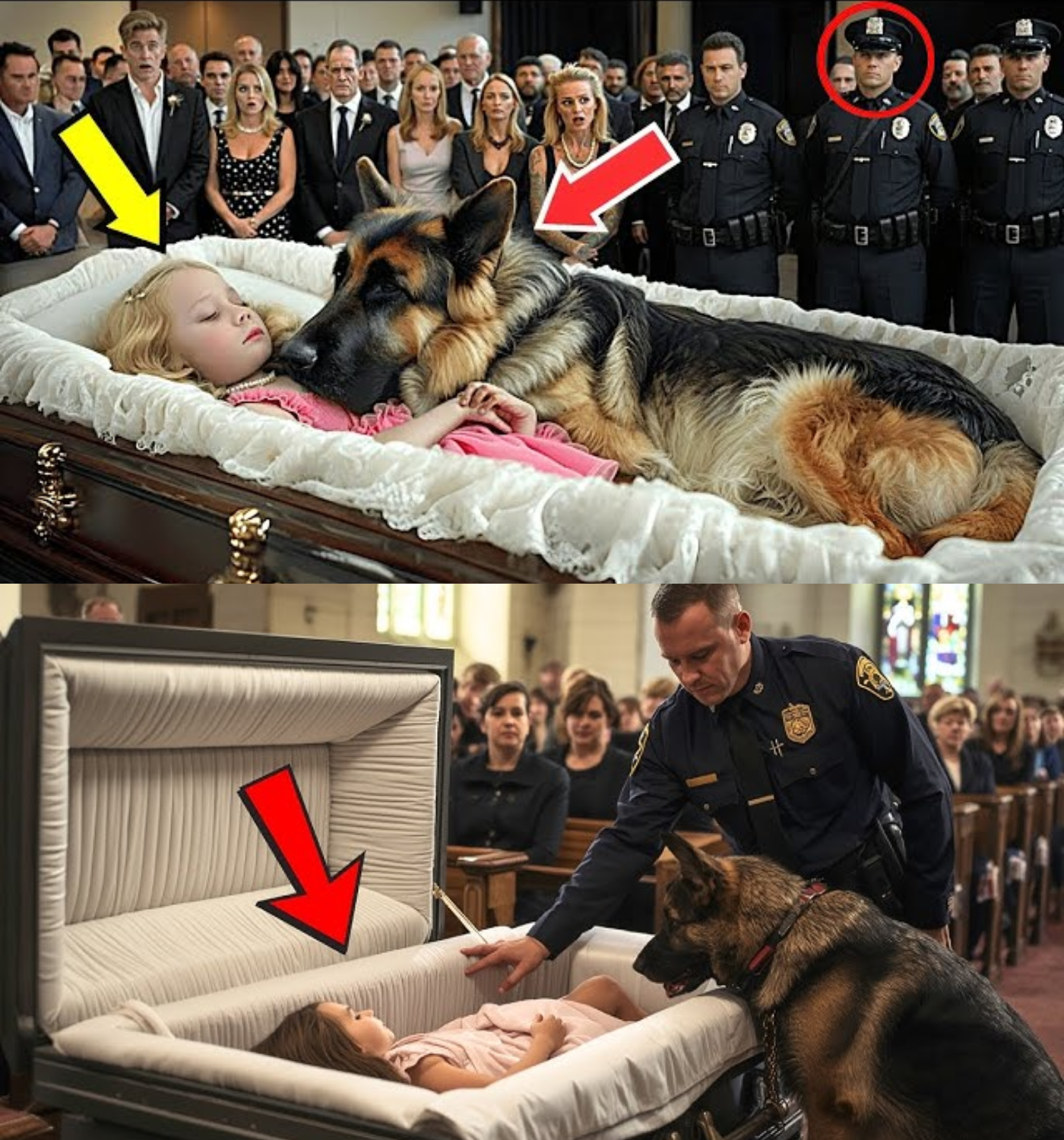 As the service began, a massive German Shepherd, named Shadow, entered the room. He was a police dog, trained for duty, but now he seemed out of place among the grieving crowd. Shadow had always been a loyal companion to Officer Blake, but today, he was fixated on Lily’s coffin. He approached it slowly, his large frame contrasting sharply with the delicate casket.