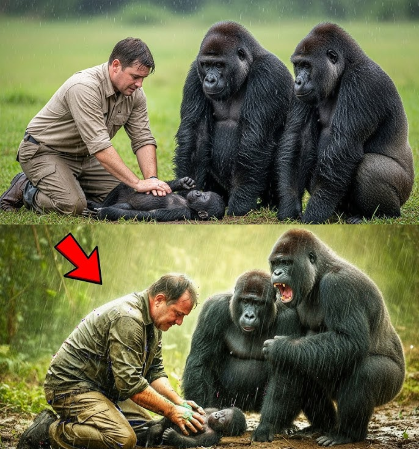 Finally, after what felt like an eternity, Elias pressed one last time, exhaled desperately, and the world held its breath. Then it happened—a small, violent cough erupted from the baby gorilla, followed by a weak gasp. The mother gorilla’s silence shattered into a high-pitched cry of pure relief, echoing through the jungle.