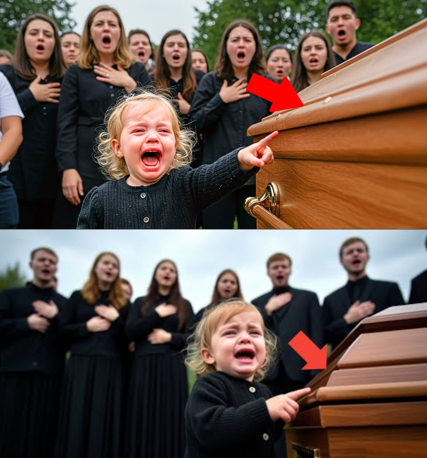 Clara looked down at her daughter, who was trembling and staring wide-eyed at a dark corner behind the coffin. Suddenly, Lucy let out a piercing scream, “Papa is trapped! He’s calling for help!”