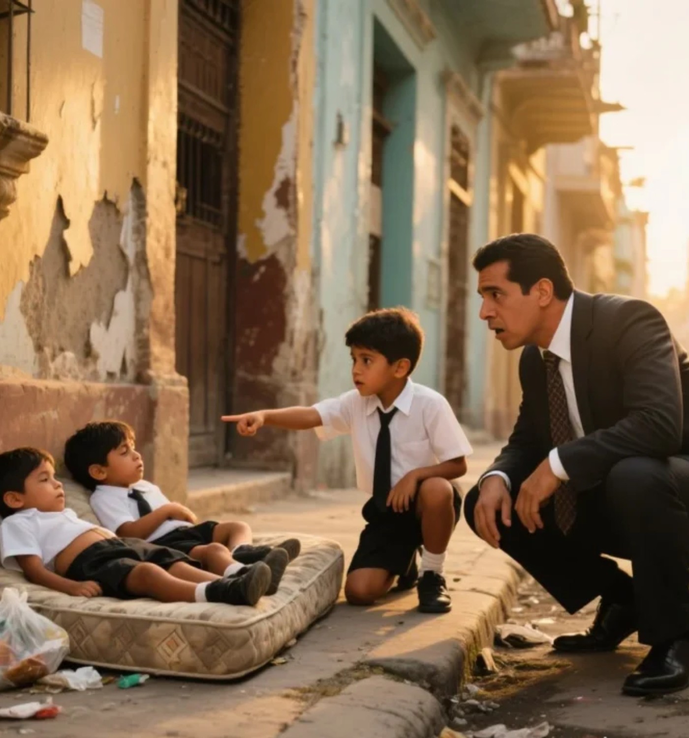 “Pedro! Come back!” Eduardo shouted, his voice echoing between the narrow walls of the alley, but Pedro was already crouched beside a filthy mattress, his tiny frame trembling. Eduardo ran to him, heart hammering in his chest. Around the mattress were garbage bags ripped open, cardboard flattened under soggy rainwater, and the unmistakable stench of neglect. Two children lay curled up on the mattress, barefoot, clothed in rags, their skin smudged with dirt and grime.