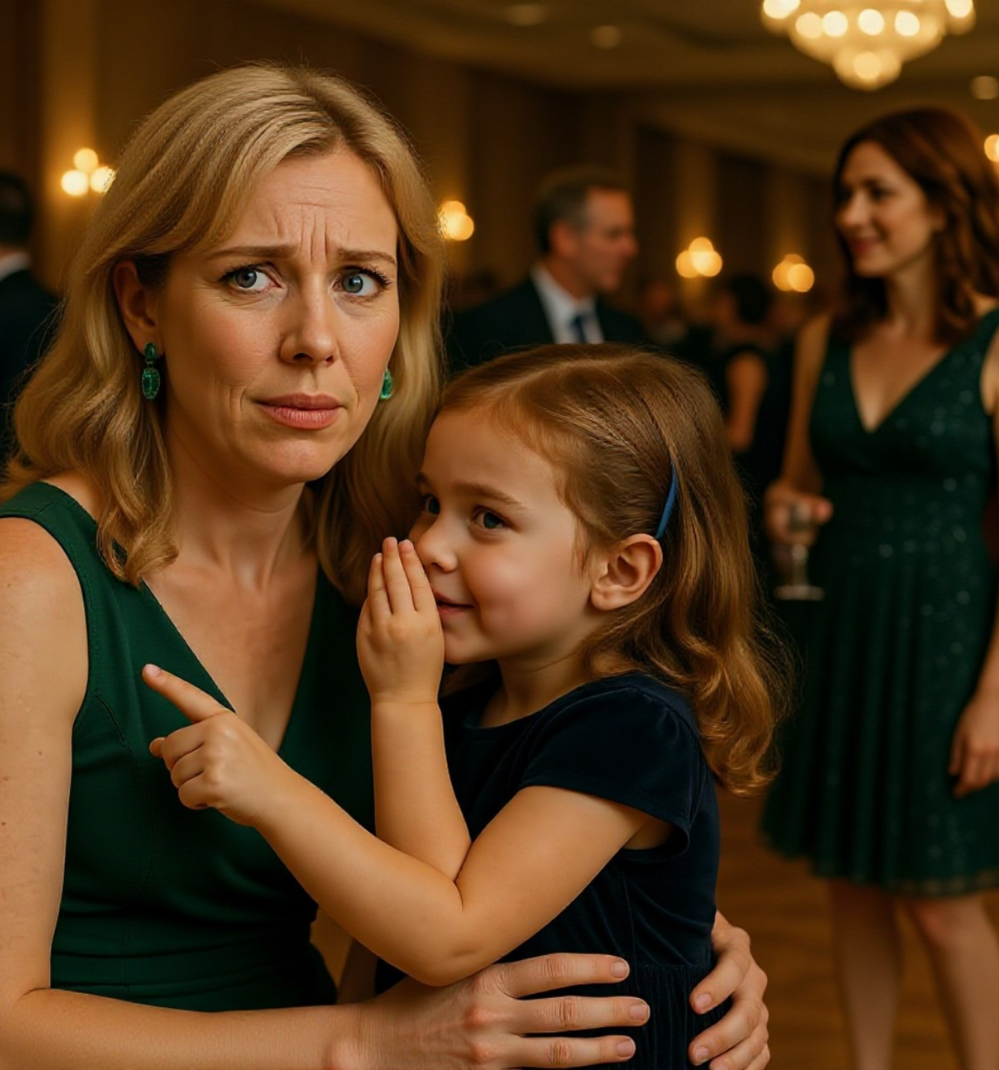 Time seemed to freeze. The laughter around them faded into an eerie silence, as if the world had suddenly hit pause. Emily felt her heart drop, the color draining from her face. She turned slowly in the direction Lily was pointing, her breath hitching in her throat.
