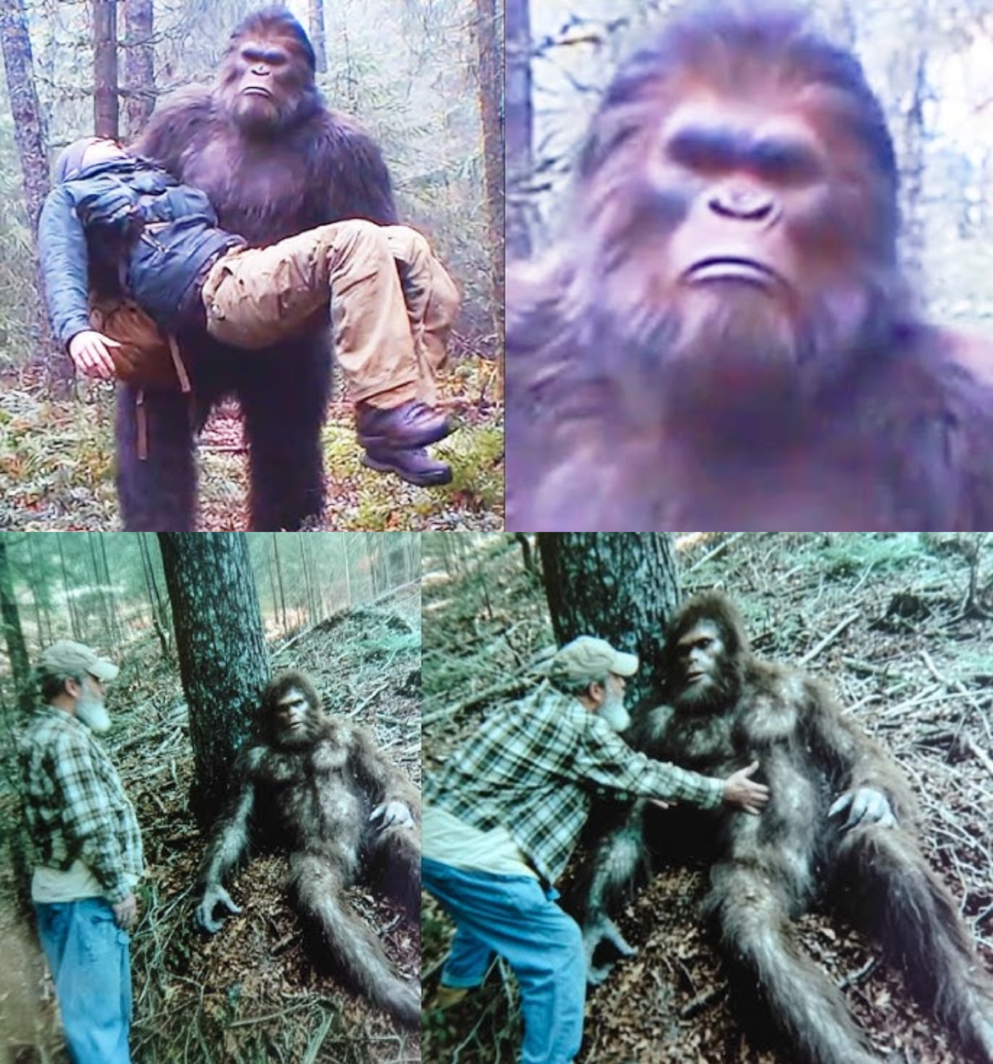 The first few images were mundane—deer grazing, birds flitting through the trees. But then we reached the fifth photo, and everything changed. The image was crystal clear, illuminated by the afternoon sun filtering through the forest canopy. In the center of the frame stood a massive figure, easily seven or eight feet tall, covered in dark brown fur. It cradled something in its arms, something that sent my heart racing—a person, unconscious, draped in a blue jacket and khaki pants.