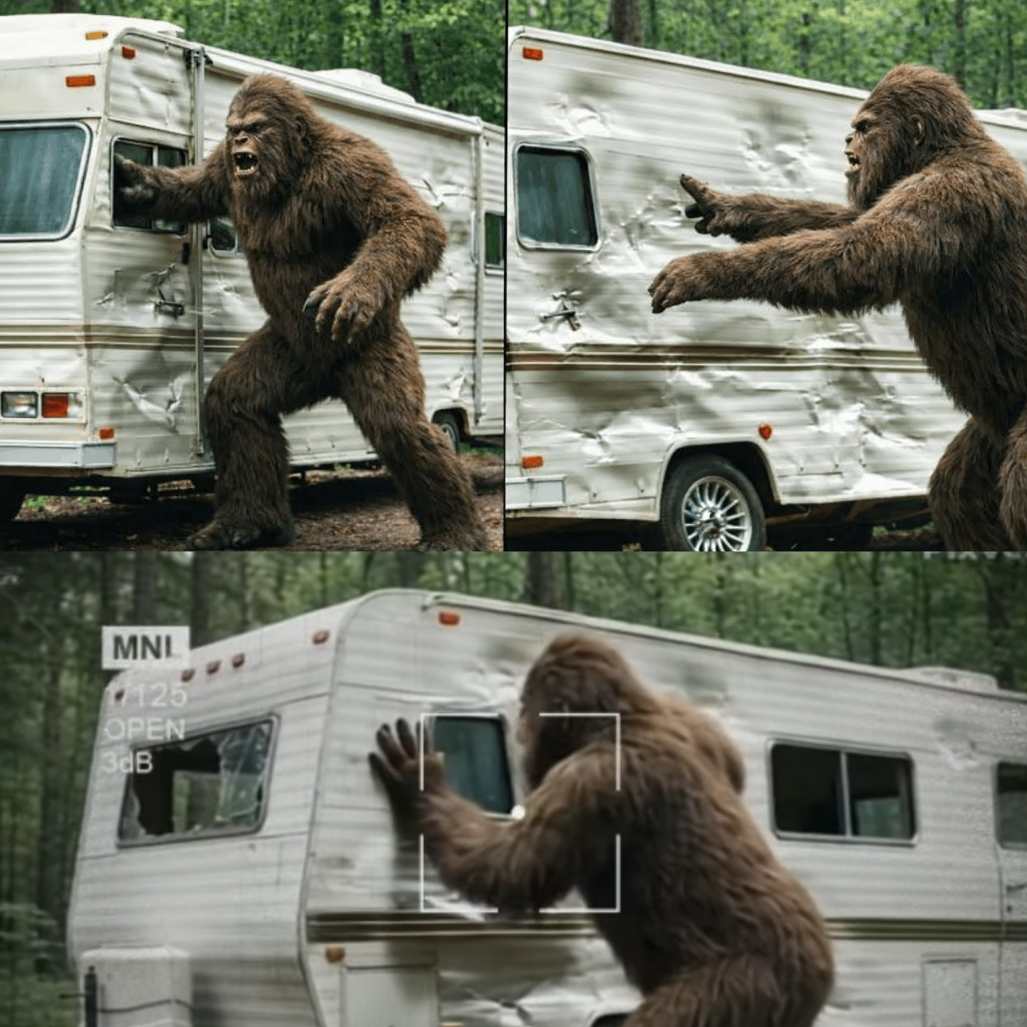 Dents in the trailer’s aluminum siding—too high for any animal. Too spaced. Too deliberate. And the car… God, the car. Metal twisted like clay. Axles bent. Wheels torn at angles that physics shouldn’t allow.