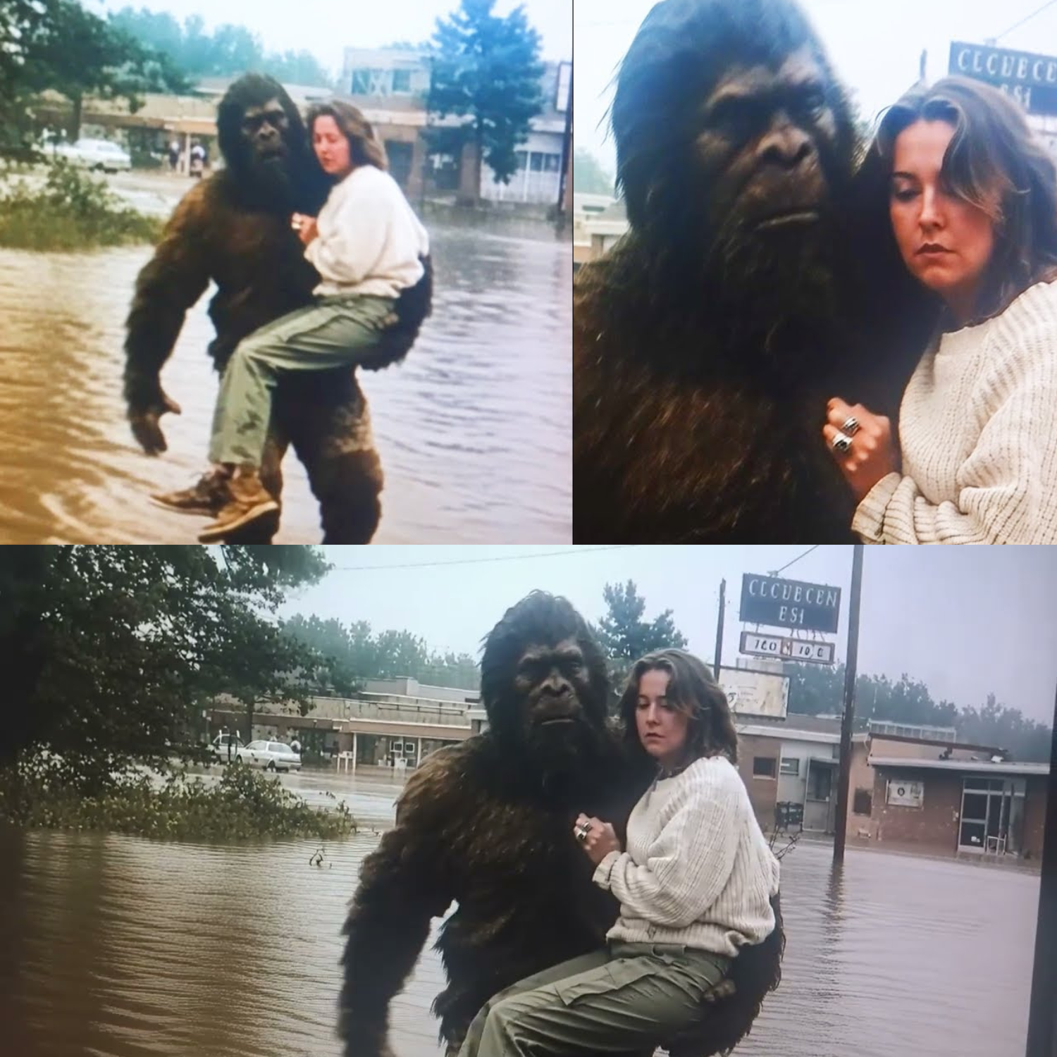 It stood nearly eight feet tall, fur hanging slick against a massive frame. A hulking shape moving upright like a man — but no man could be that size, or walk that powerfully through chest‑deep floodwater. And in its arms, held gently against its chest, was a human being — limp, unconscious… alive.
