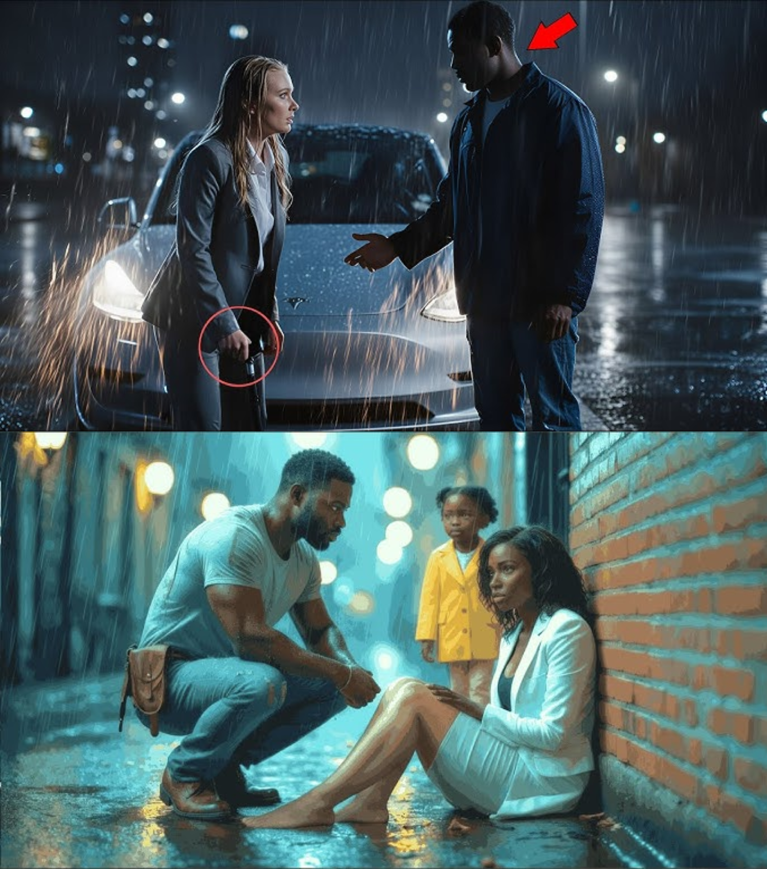 It began in a rain-soaked alley, with a woman’s desperate plea: “Please don’t hurt me. I can’t walk.” Her white designer suit was smeared with dirt, her ankle twisted at an unnatural angle. As her attacker loomed, a stranger stepped out of the shadows. He was a tall, rugged man carrying a little girl, his expression tired from a long day. But without hesitation, he commanded the aggressor to “Step away from her now,” and in his steady, unflinching gaze, a new story began.