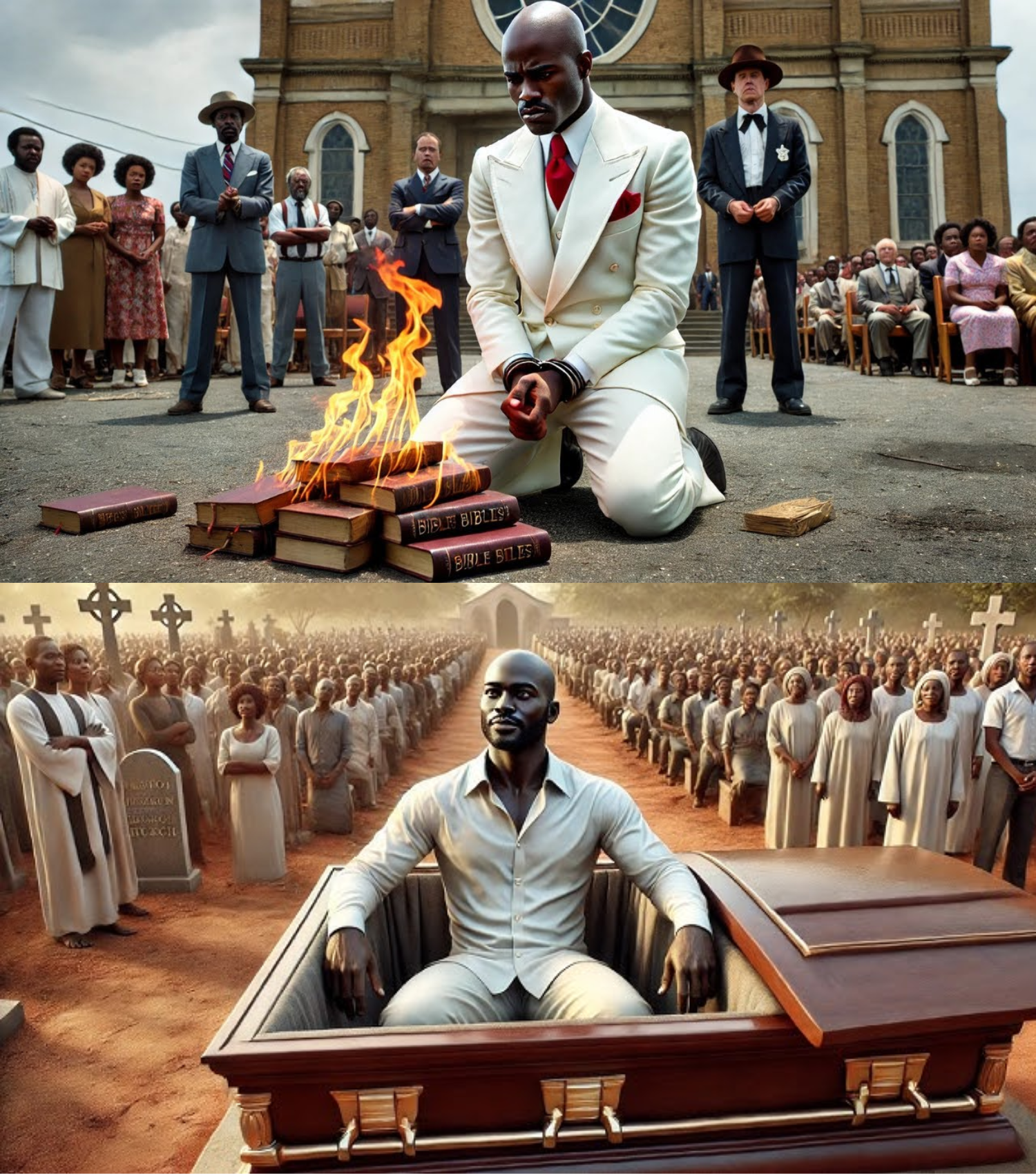 The story began with Musa, a blind beggar known to all, who sat by the market gate for years. A young boy, Jonah, urged him to visit Pastor Abel’s church, promising miracles where others had failed. Reluctantly, Musa agreed. That Sunday, as Abel’s calm voice filled the simple chapel, he declared, “Someone who has never seen light, today light will find you.” Placing his faded Bible on Musa’s eyes, Abel prayed. Suddenly, Musa screamed, tore off his glasses, and wept, “I can see!” The church erupted in joy, but outside, Abel knelt, poured fuel on the Bible, and set it ablaze, leaving the crowd to wonder.