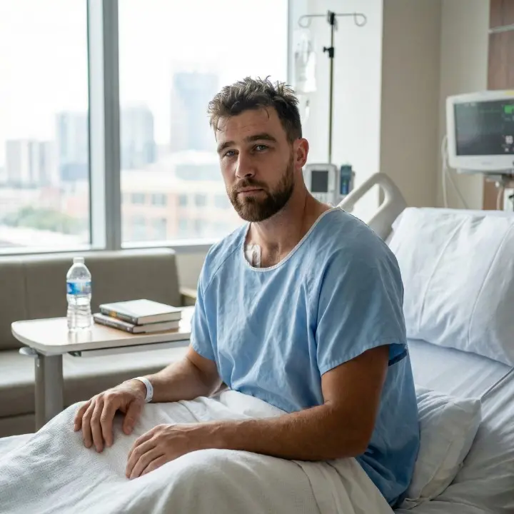 In this fictional account, just fifteen minutes ago, Travis Kelce shared his first photo from a hospital bed—confirming that something deeply personal had been unfolding away from stadium lights and highlight reels. The image was stark in its simplicity: no pads, no jersey, no crowd. Just Kelce, seated upright, calm but reflective, hands resting on a white hospital blanket.