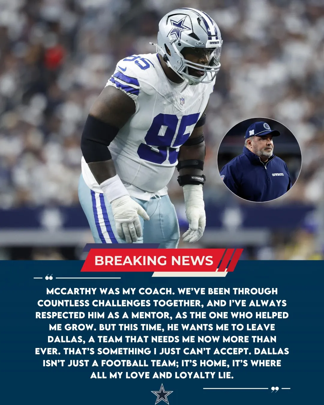 “McCarthy was my coach. We’ve been through countless challenges together, and I’ve always respected him as a mentor, as the one who helped me grow. But this time, he wants me to leave Dallas, a team that needs me now more than ever. That’s something I just can’t accept. Dallas isn’t just a football team; it’s home, it’s where all my love and loyalty lie.”